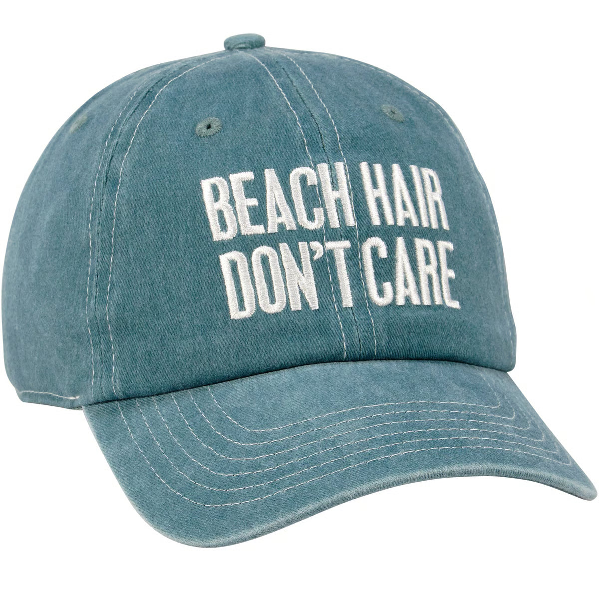 Features box sign style "Beach Hair Don't Care" sentiment embroidered in cream onto a weathered light blue base. This Beach Hair Don't Care hat is one size fits most. Hand-wash only.