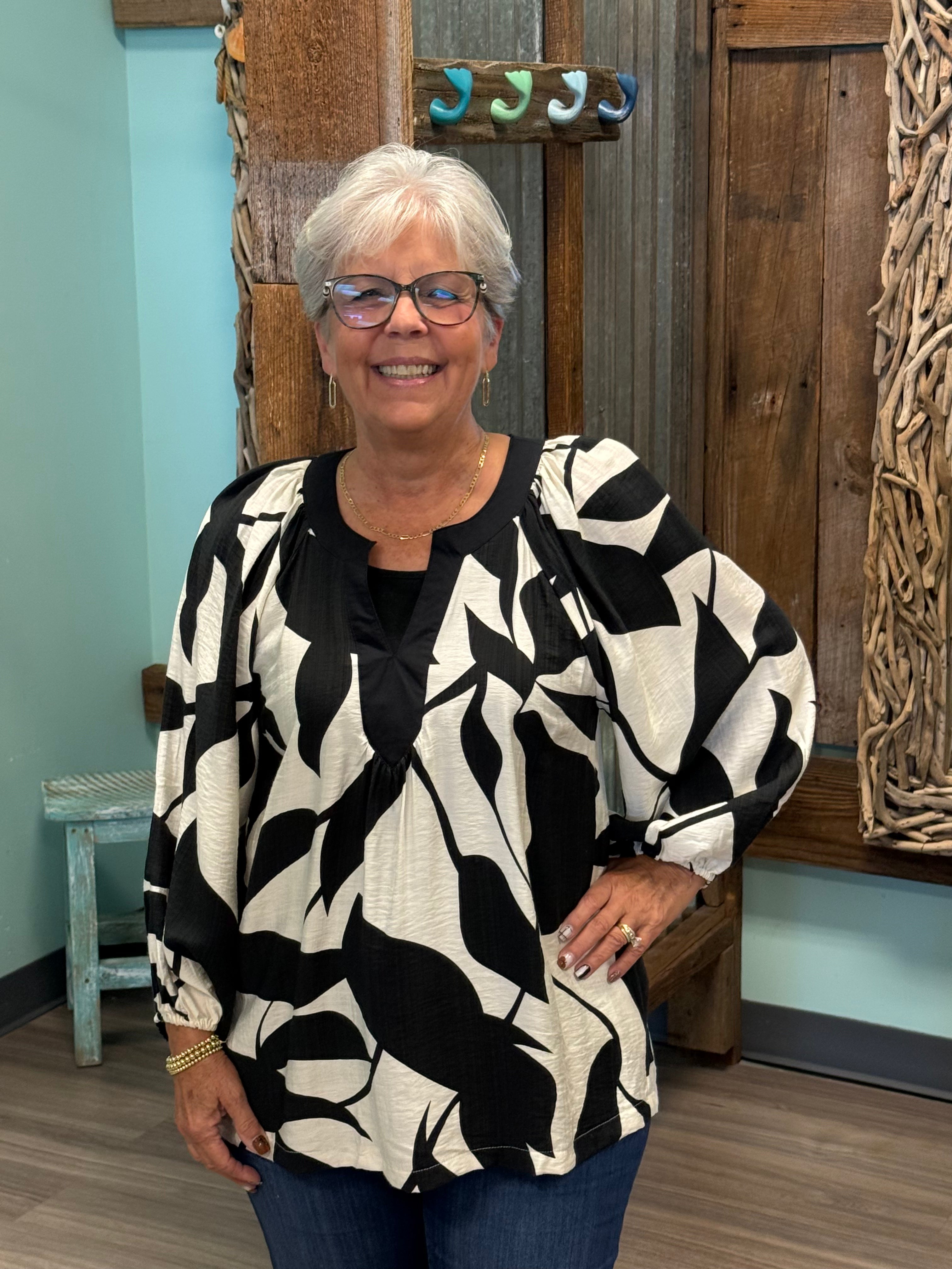 Bring on all the feels with this leaf print blouse featuring dreamy long balloon sleeves! The split V-neck and contrast detail add a chic touch to the relaxed silhouette. Tuck it into jeans or wear it loose with leggings for an effortlessly stylish look.