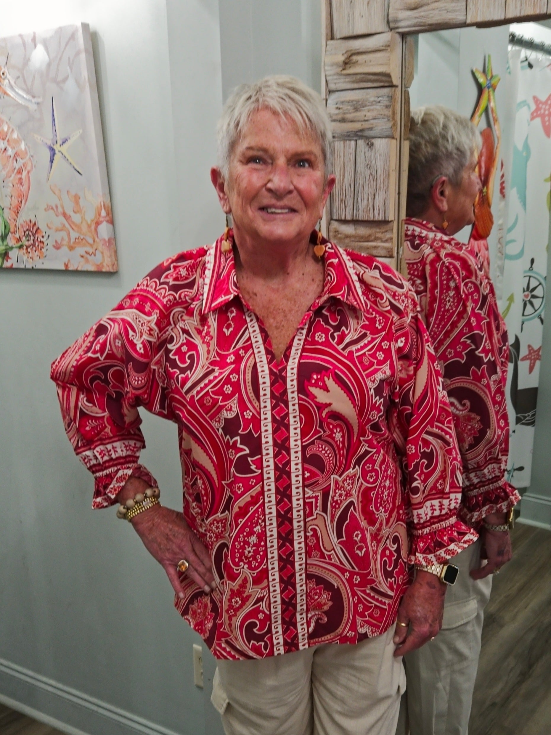 Bring a touch of whimsy to your wardrobe with the Call For You Top in Wine Mix. Featuring a vibrant paisley print and a classic button-down front, this blouse is perfect for layering or wearing on its own. The playful long sleeves end in elastic ruffle cuffs, adding a fun, flirty flair. With its comfortable, unlined design and timeless collar, it’s a stylish pick for any day you want to feel effortlessly charming.