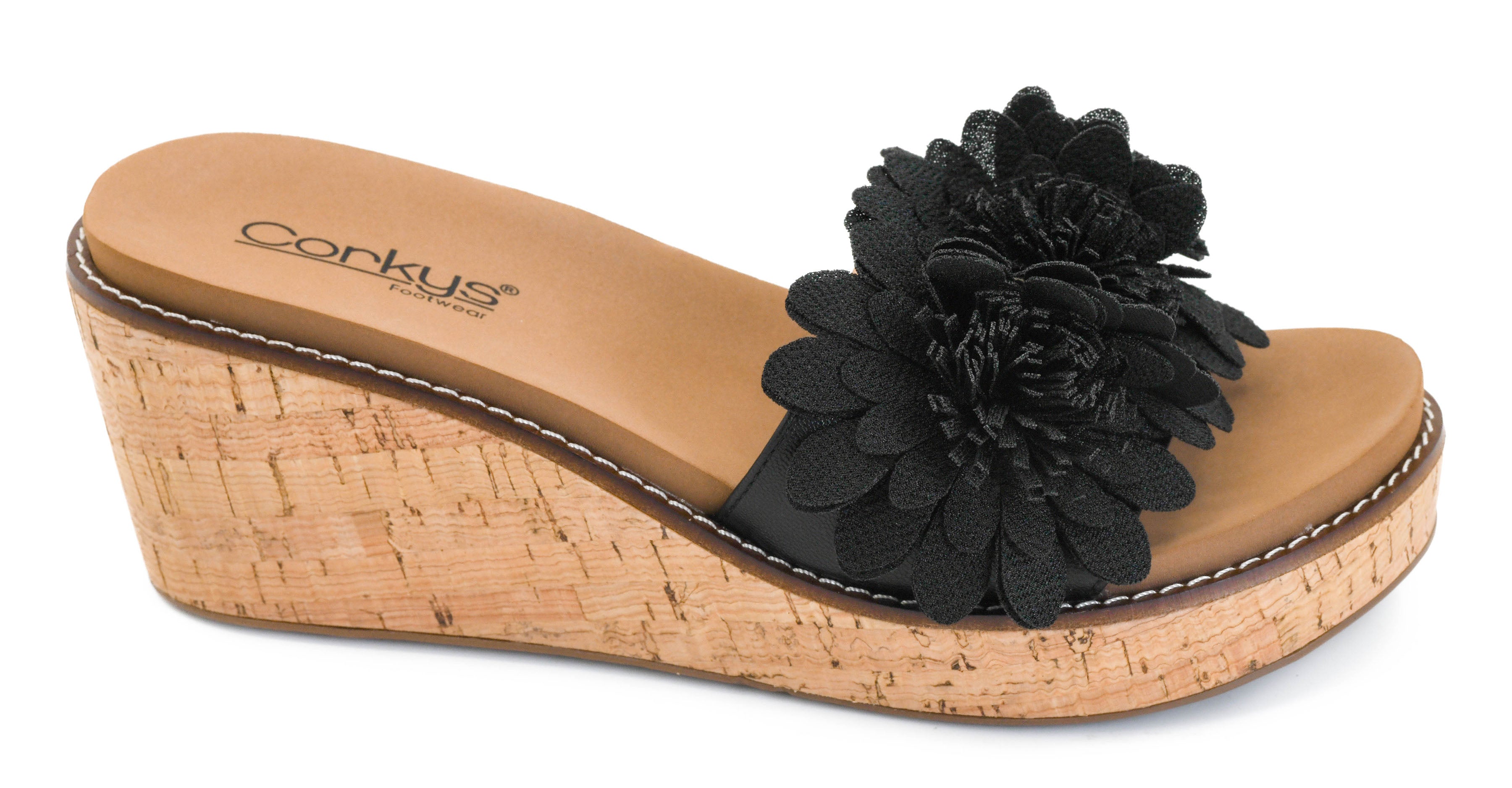 Experience the comfort you've come to expect from Corkys with the Wildflower Wedge in Black. Featuring the signature memory foam footbed that keeps your feet cushioned all day, this charming wedge delivers both style and support for the season. The elevated heel adds a flattering lift without sacrificing wearability.