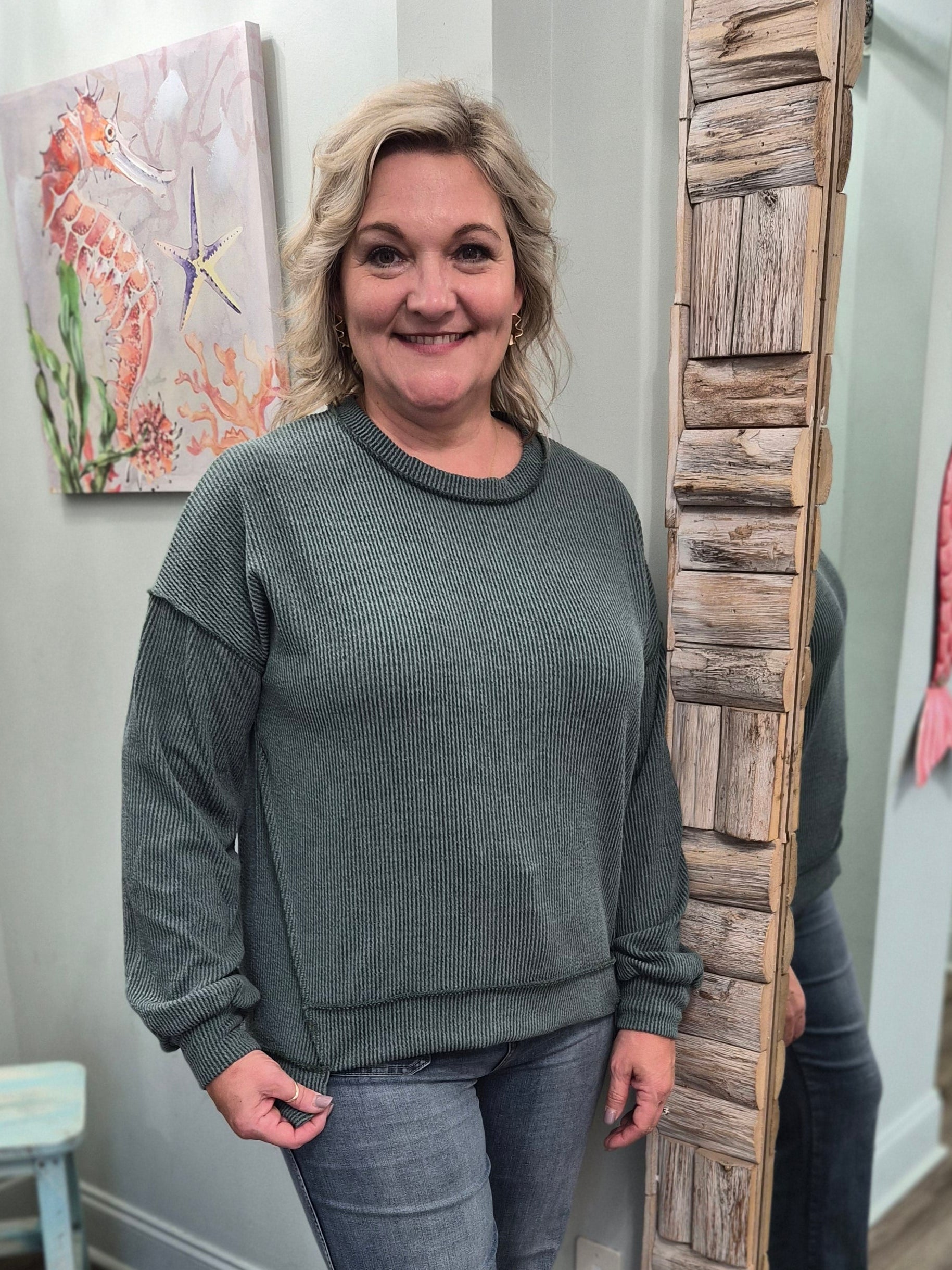 The Don't Stare Knit Top in Jade brings a playful twist to oversized comfort with its relaxed silhouette, forward side seams, and a dropped hem that adds effortless style. Its cozy crew neckline and balloon sleeves with cuffs make it perfect for everyday fun, mixing comfort with a touch of flair.