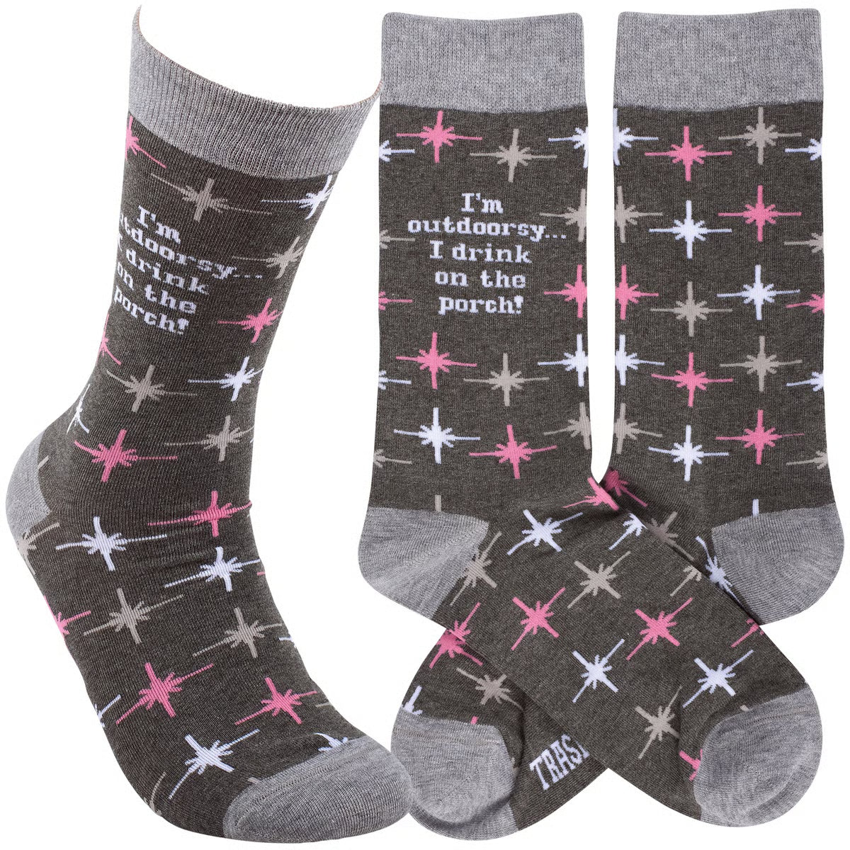 "I'm Outdoorsy... I Drink On The Porch!" These cozy socks are made with cotton, nylon, and spandex to create a one-size-fits-most design. Each pair of socks is packaged on a clear plastic hanger with header card for graceful display in store. Our I'm Outdoorsy socks call back to a vintage style with modern sassy sentiments, perfect for making a statement while getting a giggle out of others. Colorful and cozy socks always make a great gift for everyday self-expression.