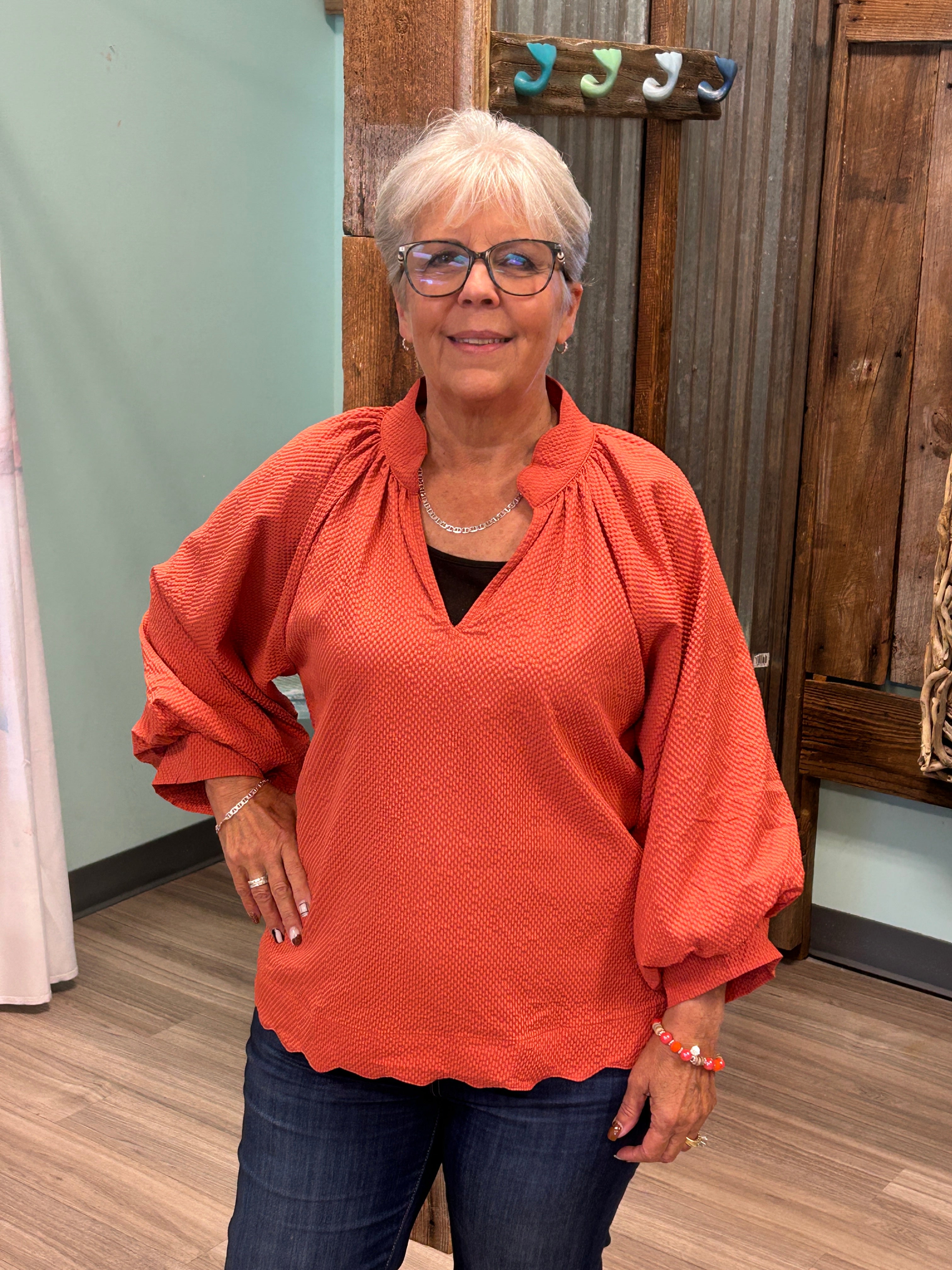 Embrace whimsical comfort in our Keep Dreaming Top! This playful blouse features a delightful waffle texture, flirty V-neckline, and charming 3/4 balloon sleeves that add just the right amount of flair. The relaxed, flowy fit dances with your movements, while the scalloped hemline adds a touch of fancy-free fun. Perfect for fall layering or solo statement-making!
