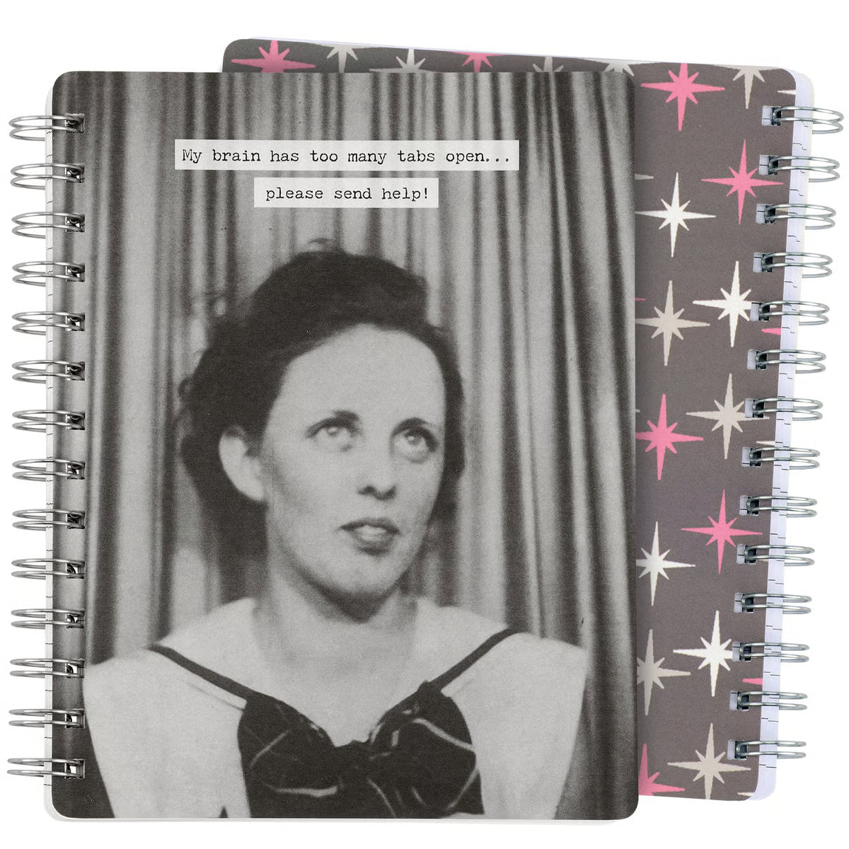 "My Brain Has Too Many Tabs Open... Please Send Help!" The back cover of the notebook features a classy pink and gray retro pattern to complete the look. Our My Brain Has Too Many Tabs Open spiral notebook includes 120 lined pages. A fun gift that calls back to a vintage style with modern sassy sentiments, perfect for making a statement while getting a giggle out of others.