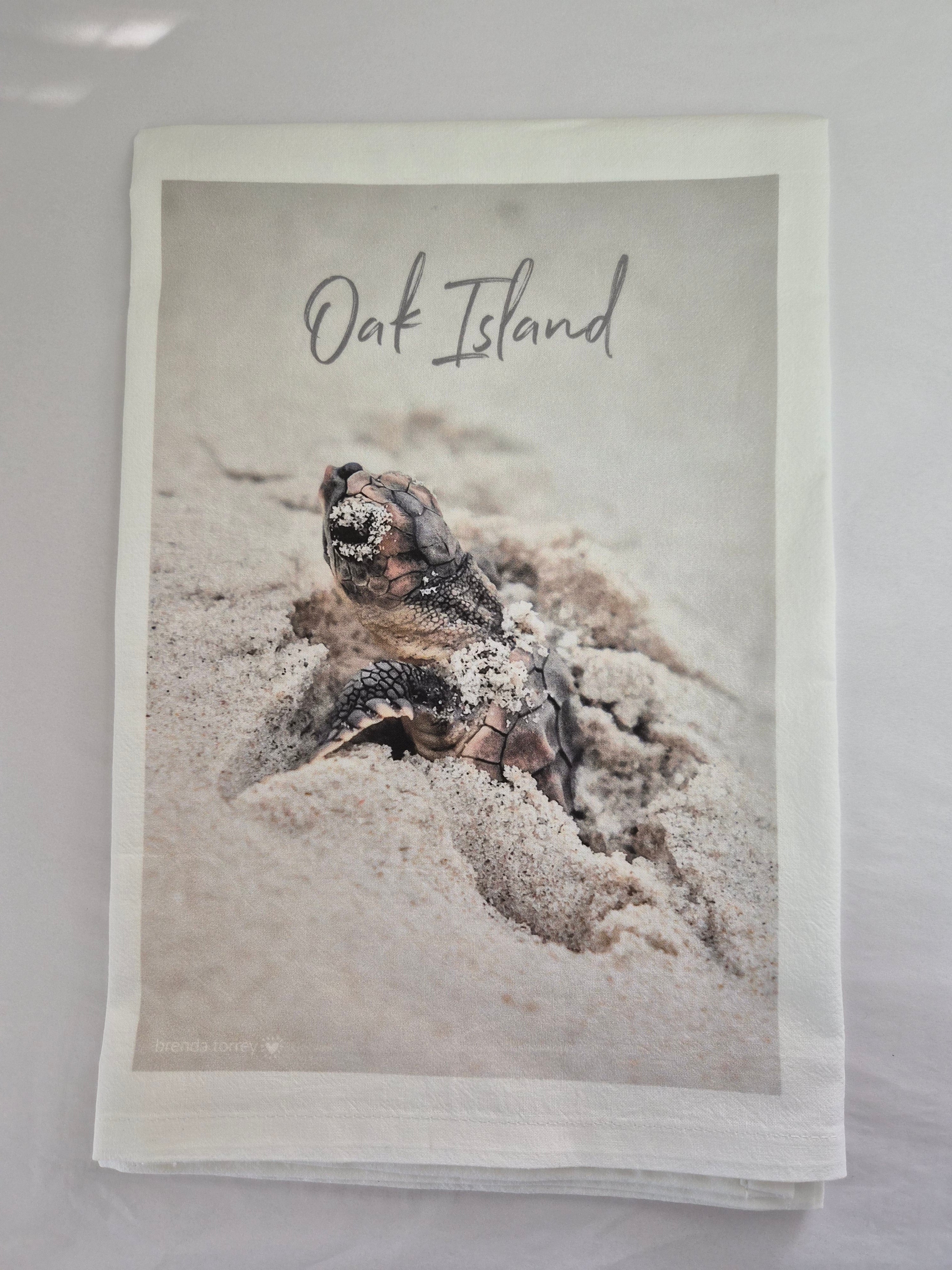 Wrap up your kitchen in coastal charm with this 100% cotton flour sack towel featuring an adorable turtle hatching our of the sand. Perfect for drying dishes, wiping hands, or displaying your love for Oak Island vibes. This playful tea towel makes an ideal gift for beach lovers and turtle enthusiasts alike. Beautifully captured photography by Brenda Torrey brings the design to life. Soft, absorbent, and durable—a functional piece that doubles as décor.