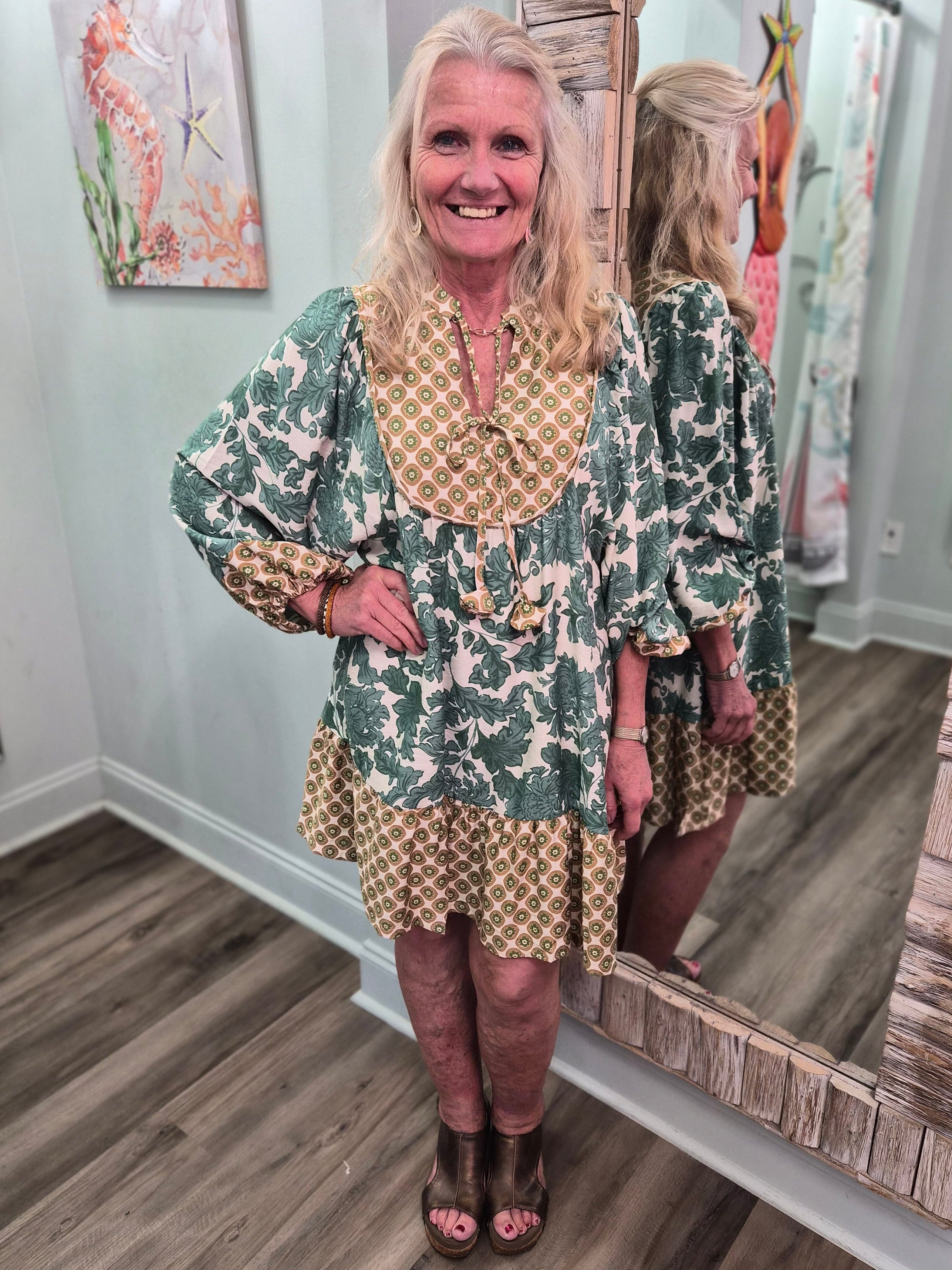 This boho mini dress mixes floral and geometric prints for a playful, free-spirited vibe. Designed with a split neckline and tie detail, round yoke, and long balloon sleeves, it’s full of charming detail. The tiered silhouette makes it easy to wear from brunch to weekend outings in effortless style.