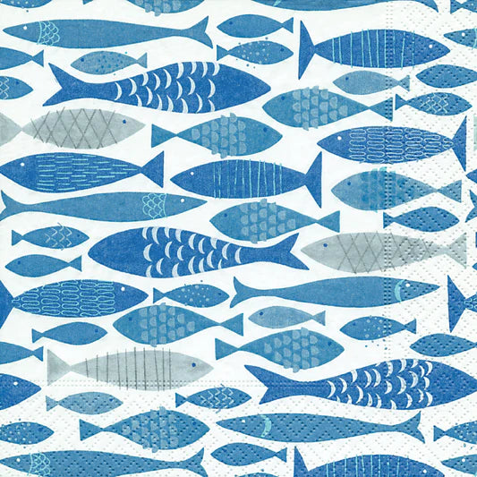 Bring breezy coastal charm to the bar cart with the School Of Fish Cocktail Napkin, featuring an artful swim of blue fish across soft paper. Sized for cocktails and small bites, this easygoing paper accent reels in a nautical look for everyday entertaining. Approximate dimensions are 5 x 5 x 1 inches. German printed on soft, 3-ply paper.