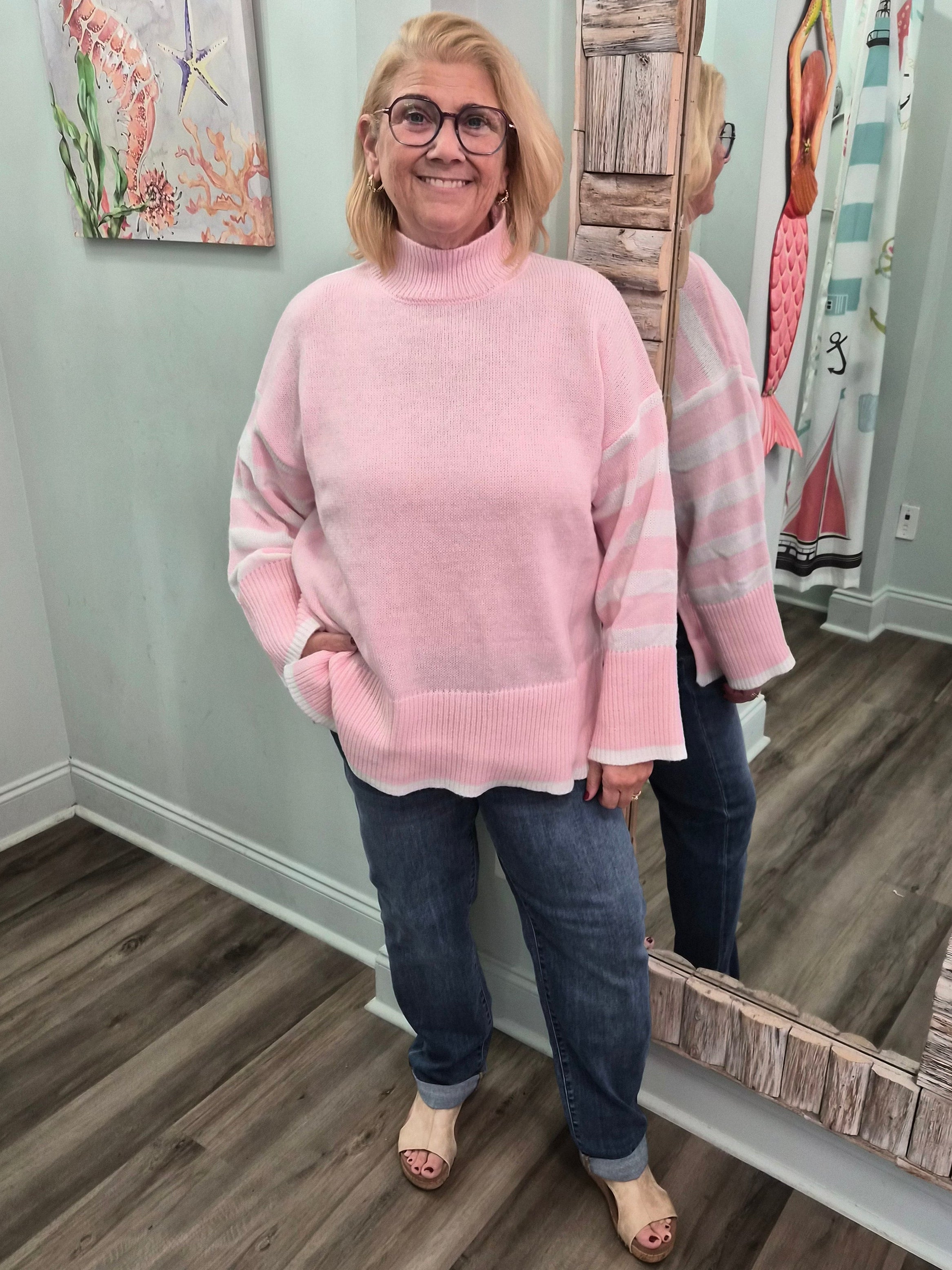 Cozy meets playful in this striped pullover that’s made for easy days and comfy vibes. The soft knit design features a relaxed silhouette, wide ribbed trim, and a mock neck that adds just the right touch of polish. With a fun mix of solid and stripe details, this sweater is the ultimate throw-on-and-go essential.