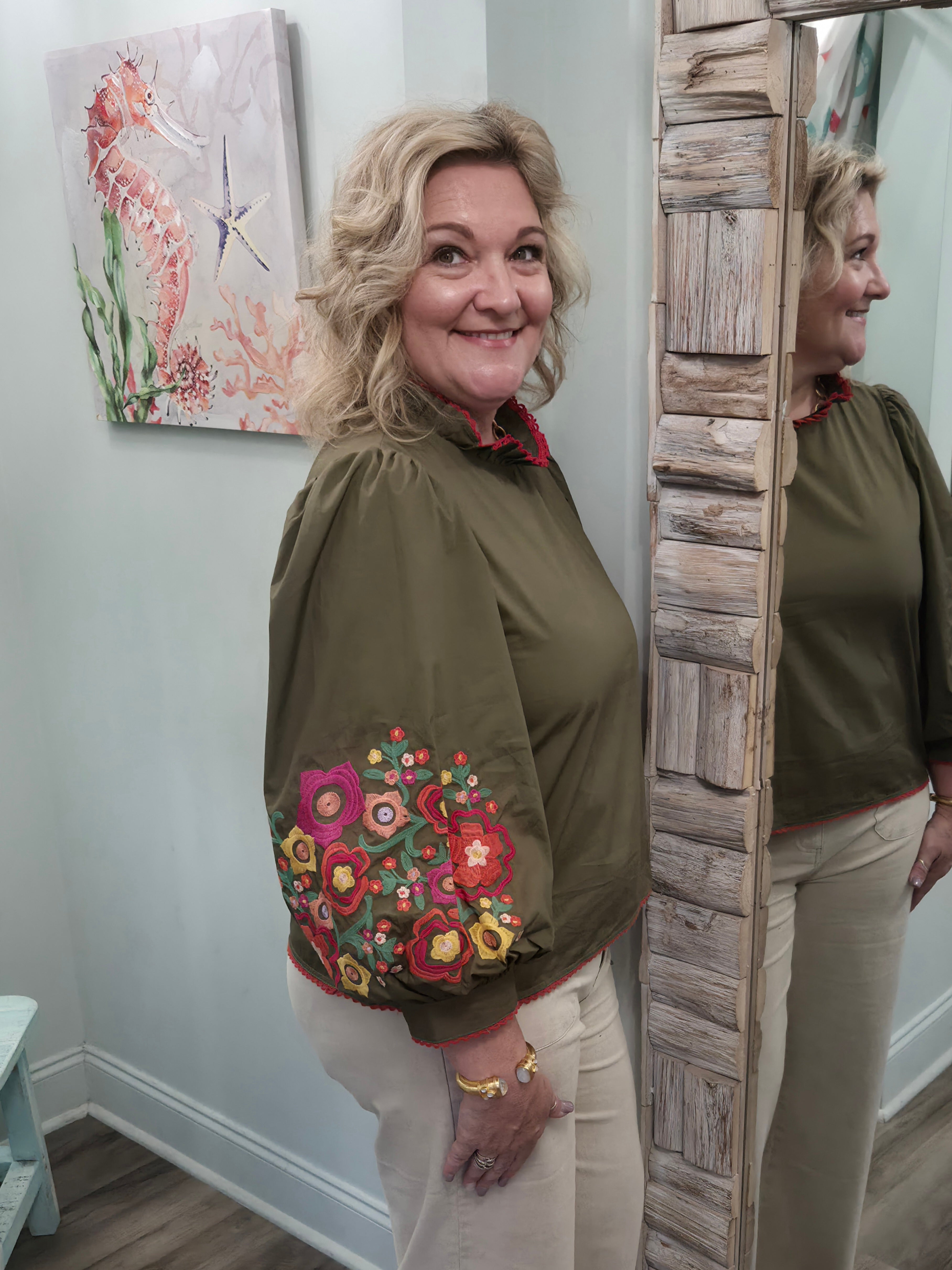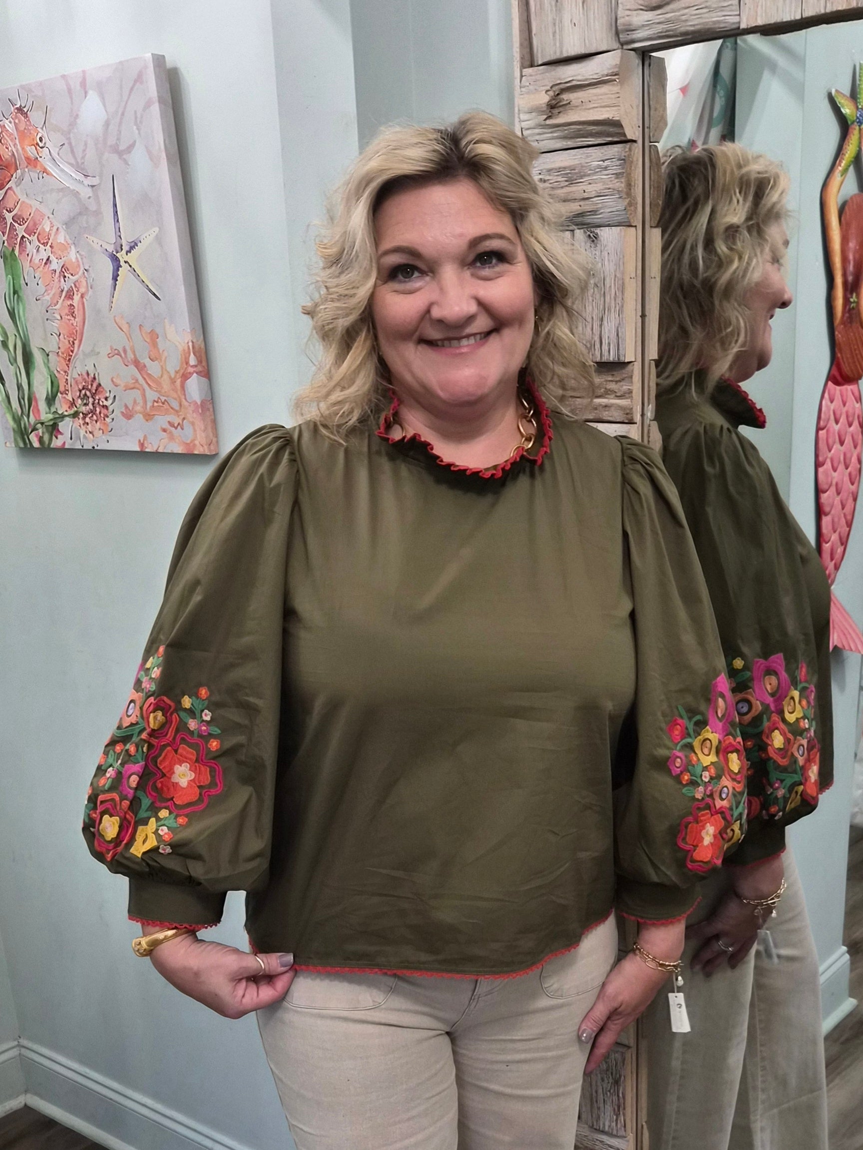 Sweet and statement-making, this top features 3/4 balloon sleeves, delicate embroidery, and a ruffled mock neck for that extra flair. The lace trim adds a romantic touch you’ll love. Pair it with jeans or a midi skirt for an effortlessly polished, feminine look!