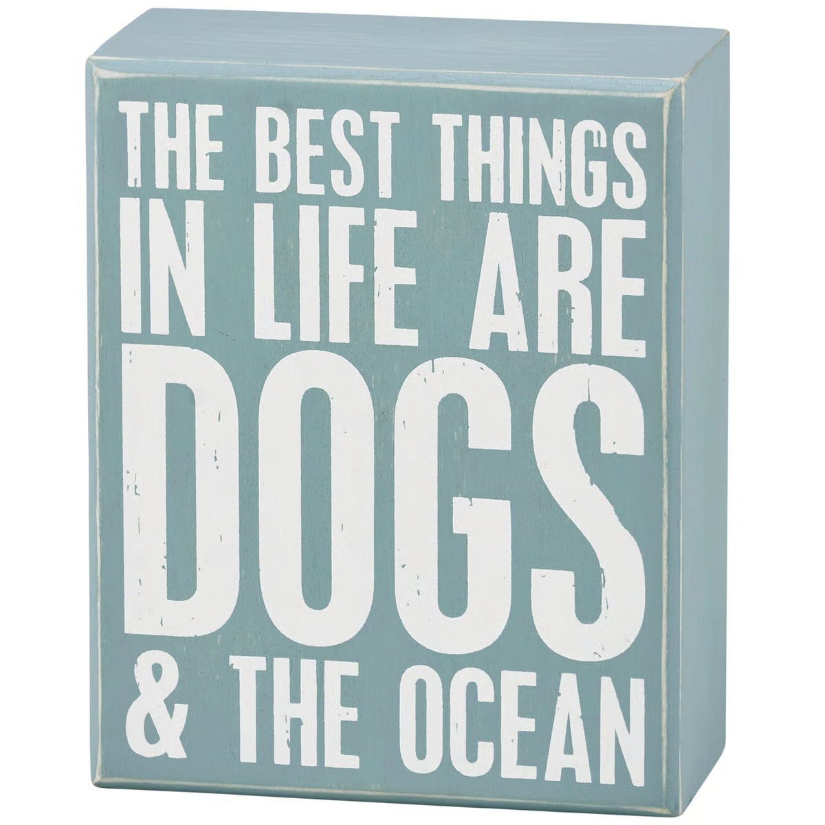 "The Best Things In Life Are Dogs & The Ocean." Box sign features distressed details with coordinating ocean blue color on sides and back. Our Dogs & Ocean box sign is easy to hang or can free-stand alone. A fun beach-themed home accent with a variety of display options.