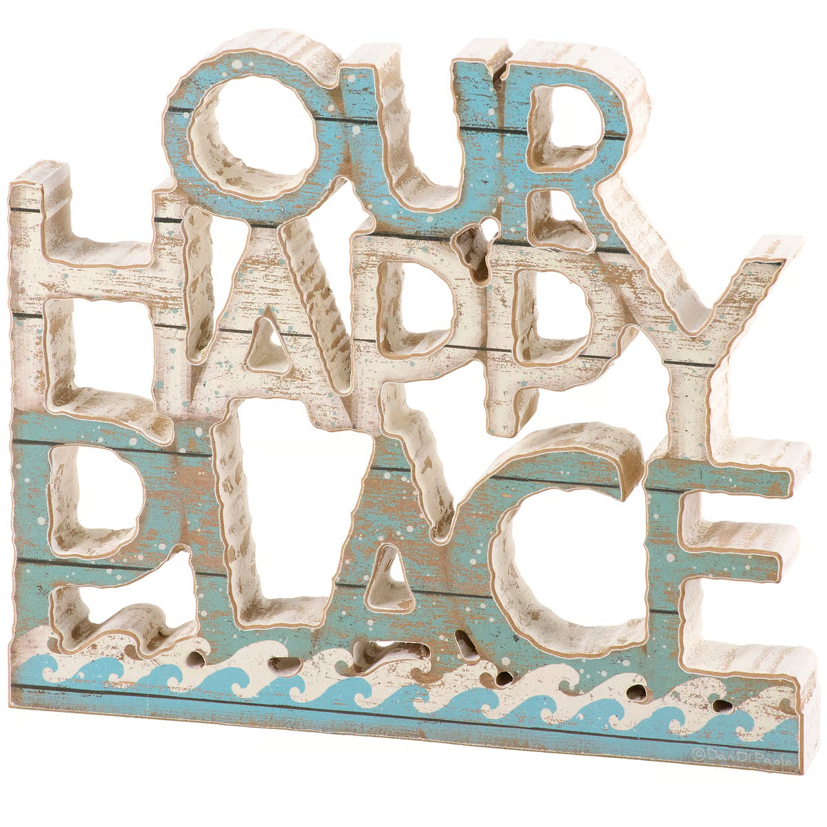 featuring a slatted and stacked "Our Happy Place" sentiment with wave designs. Our Happy Place sign complements well with coordinating design pieces.