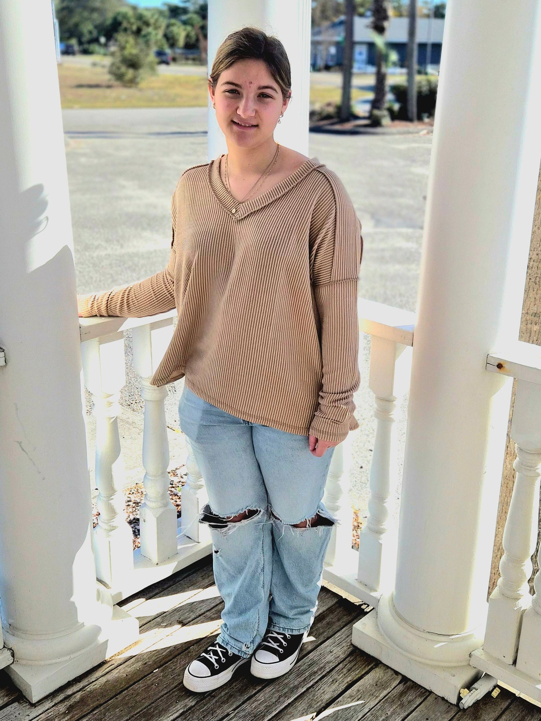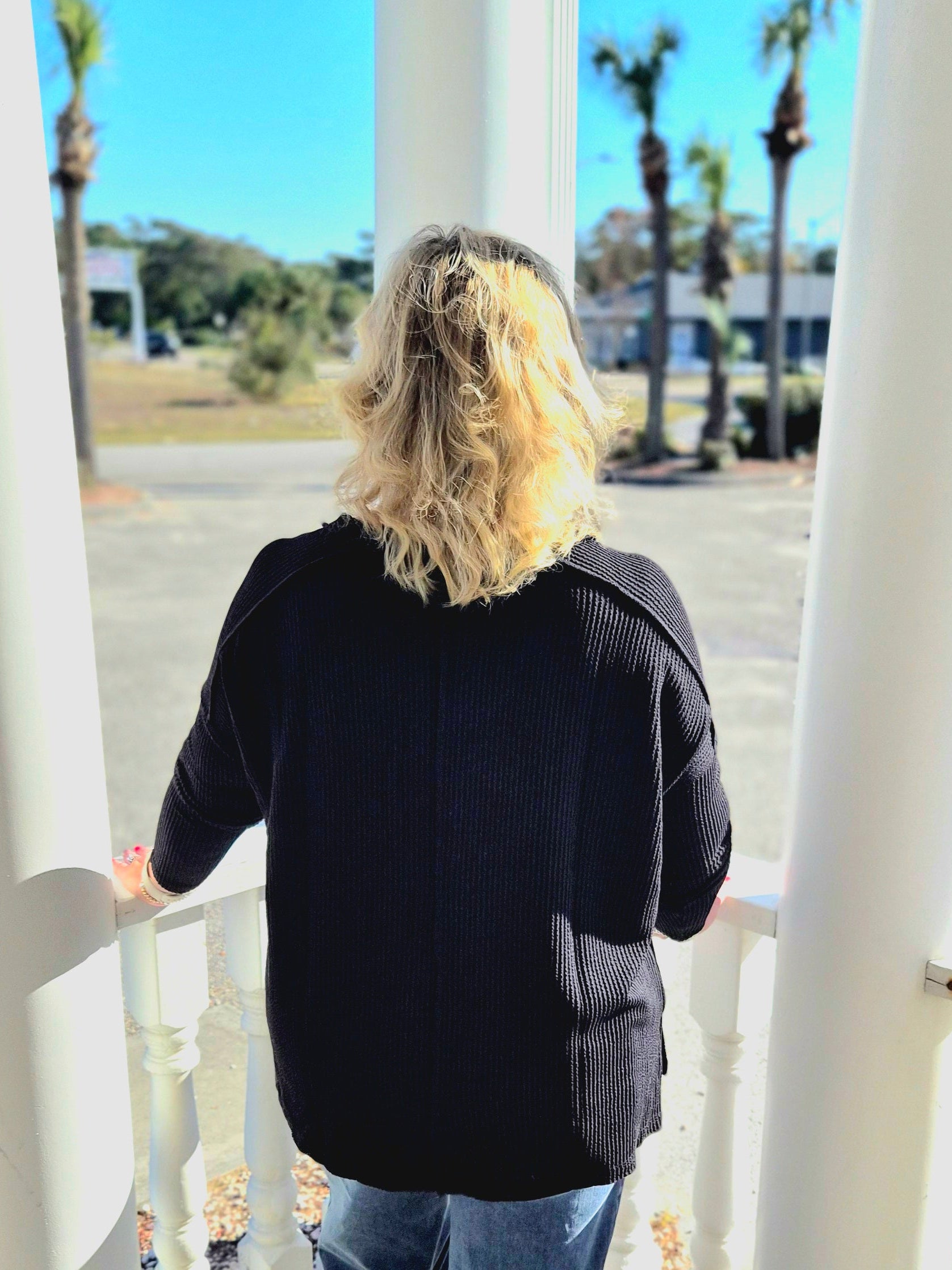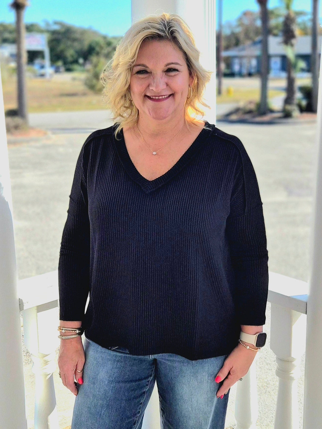 Slip into effortless style with this raised rib long sleeve top, perfect for those "out for the day" moments. The relaxed fit hugs you in all the right ways without feeling restrictive, while the hi-low hem adds a flirty touch to your everyday look. Exposed seams bring an edgy, modern vibe that elevates the classic v-neck silhouette. Whether you're running errands or meeting friends, this versatile piece is your new go-to for comfort that doesn't compromise on cool.
