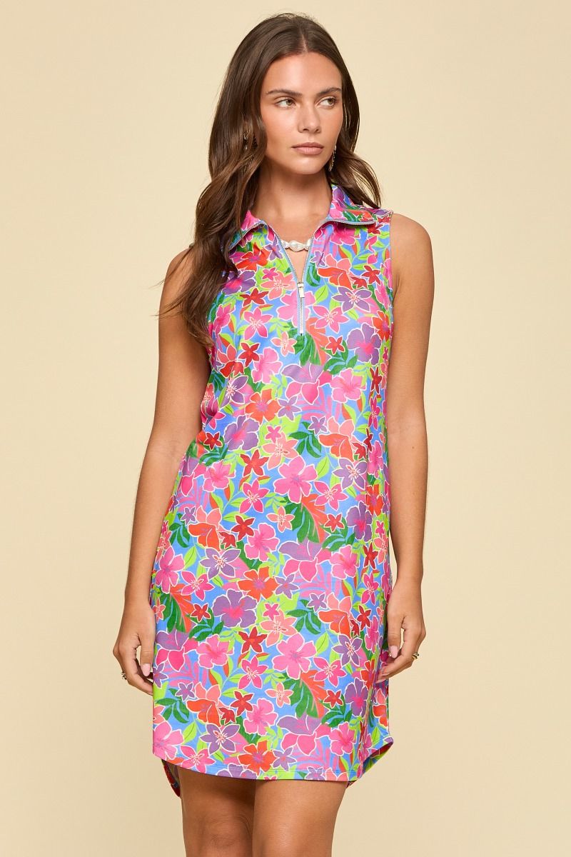 Elevate your active wardrobe with the Blooming Tune Dress in Multi. This sleeveless stunner features a crisp collared neckline, convenient front zipper, and flattering A-line silhouette that transitions seamlessly from the tennis court to the golf course to weekend brunch. The breathable 95% nylon, 5% spandex blend offers stretch and durability for unrestricted movement, keeping you comfortable throughout your day. Whether you're serving an ace or running errands, this versatile dress is your go-to essential for any occasion.