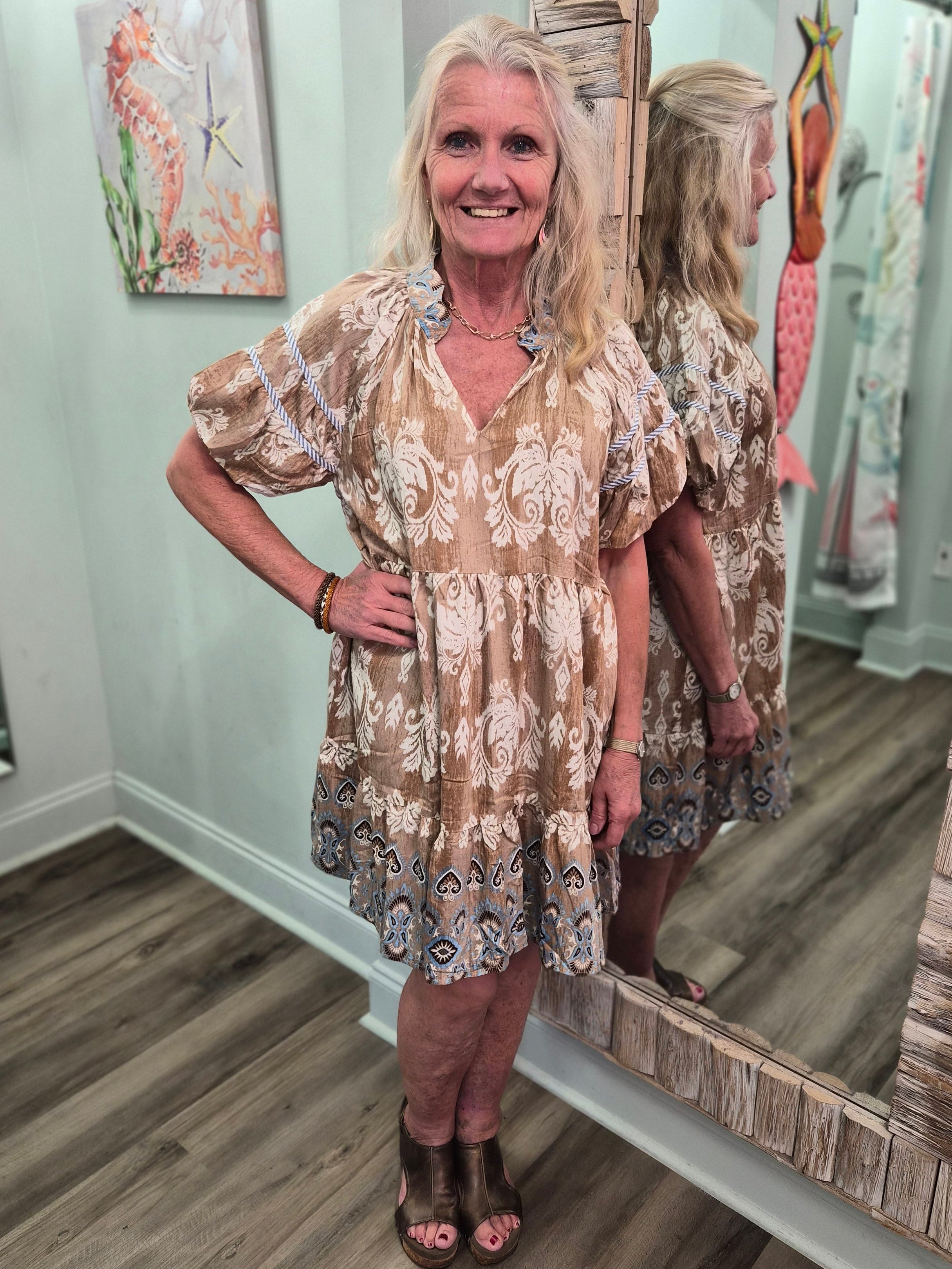 This flirty floral mini dress brings all the boho vibes with its tiered silhouette, puff sleeves, and breezy fit. The V-neckline adds a touch of charm, making it perfect for sunny days and casual outings. Style it with ankle boots or strappy sandals for an effortlessly cute look!