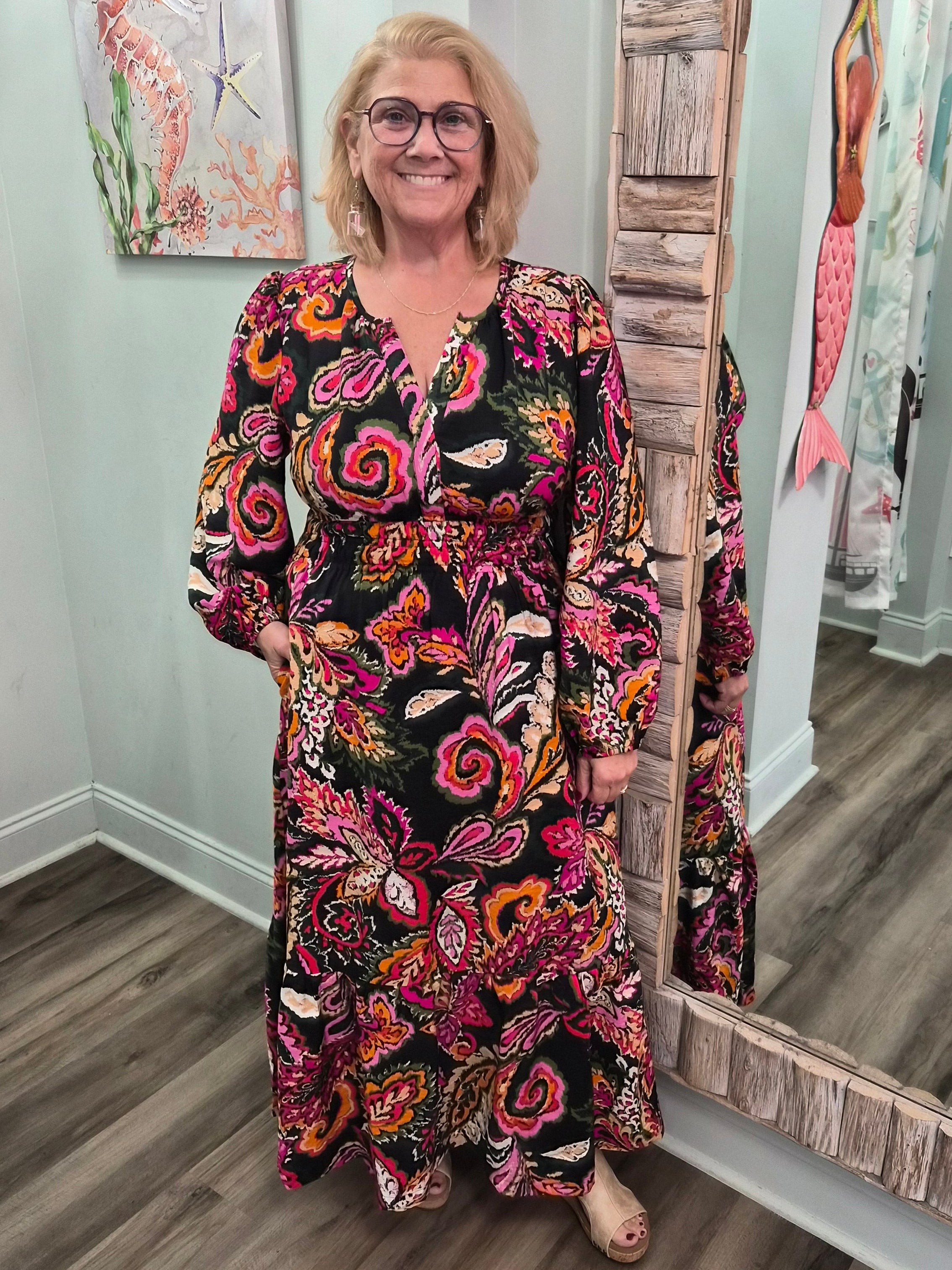This paisley floral midi dress is a total boho dream with its ruffled hem and flattering smocked waistline! The long sleeves add a touch of elegance, perfect for cooler days. Pair it with boots and a wide-brim hat for your next brunch, market stroll, or fall photo op!
