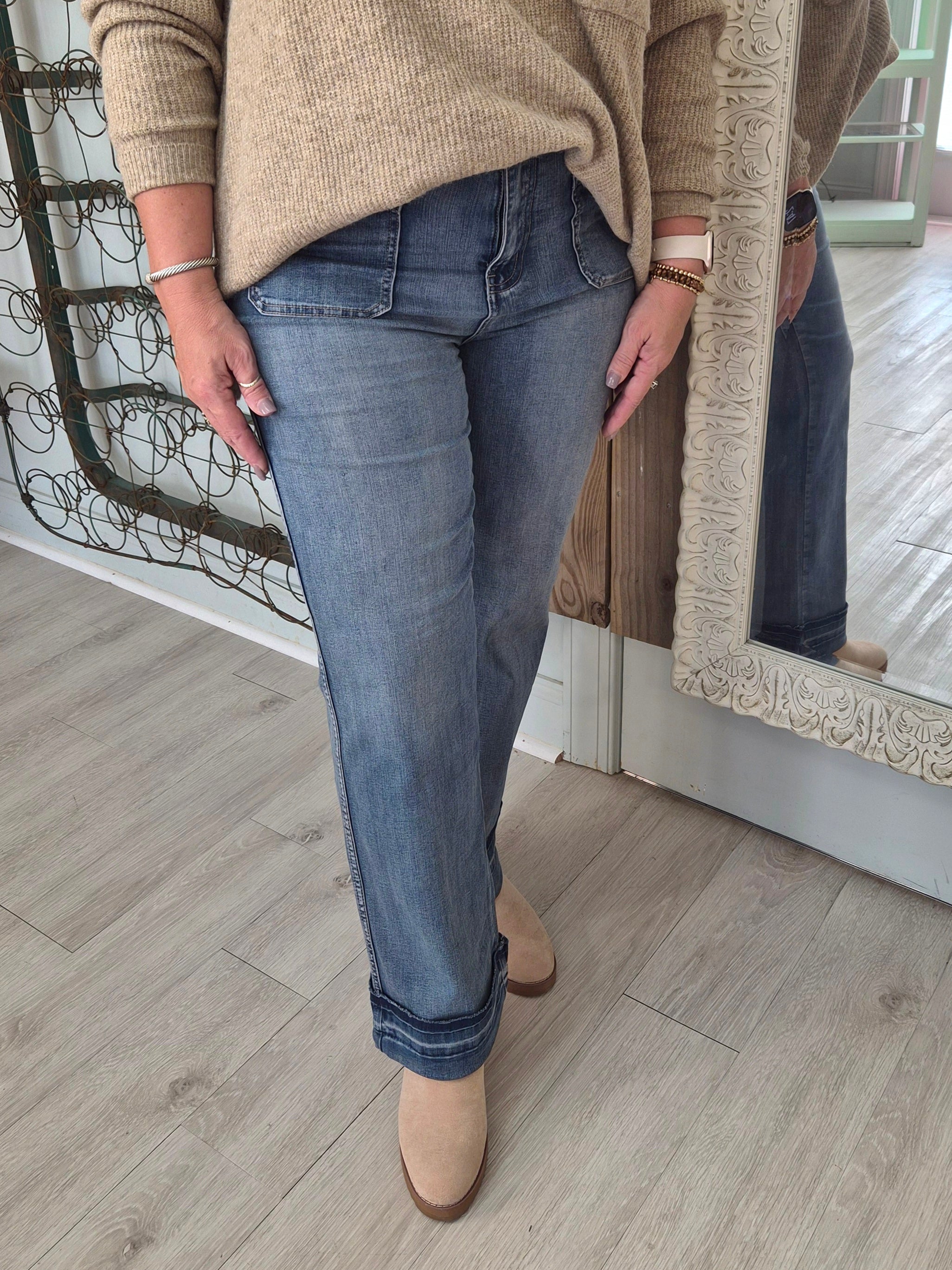 Step into timeless style with these Simply Needed Patch Pocket High Waisted Jeans in Indigo. Featuring a flattering high-waist, wide-leg silhouette with button and zip fly closure, these vintage-inspired jeans get a modern makeover. Two generous patch pockets deliver that classic utility vibe, while the raw-edge hem adds an effortlessly cool edge. Perfect for pairing with your favorite tee or sweater, these jeans are the denim essential that'll have you feeling like the main character in your own style story.