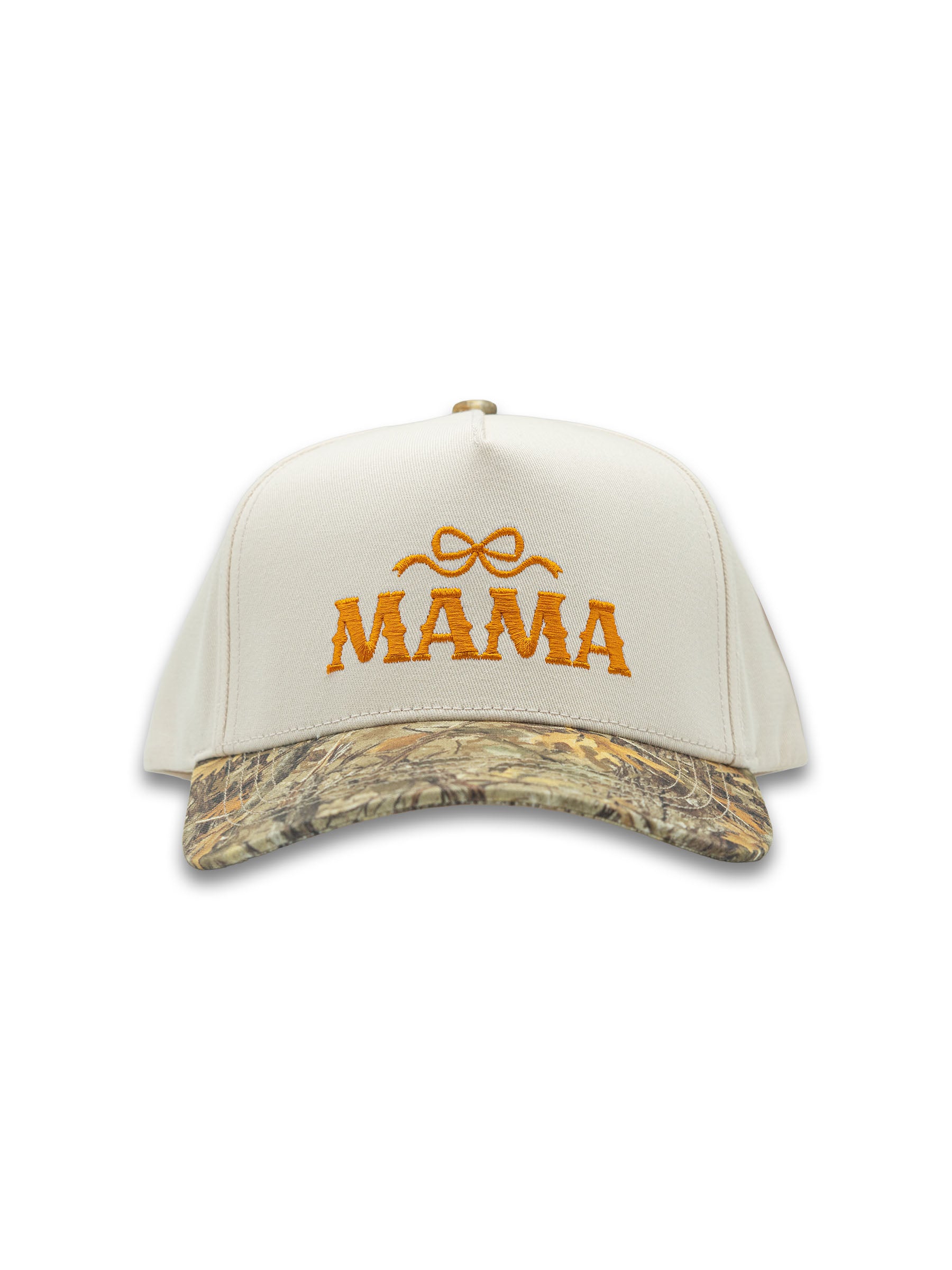 Adorable embroidered "mama" design with a delicate bow accent sits perfectly on this white snapback cap. The camo-patterned brim adds a playful edge to this sweet style. Perfect for moms who want comfort and personality in one charming hat.