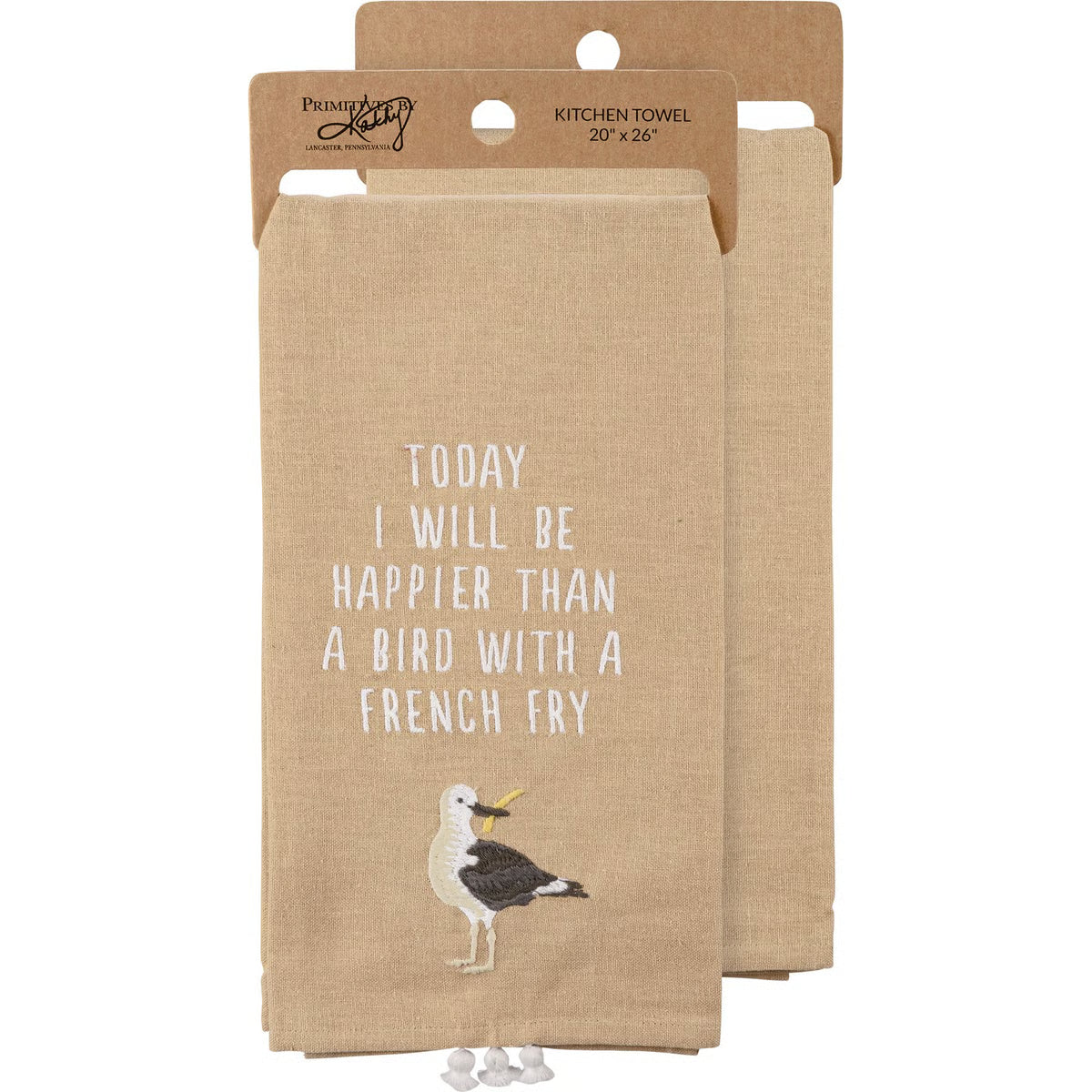 A cotton linen blend kitchen towel featuring a stitched art panel with embroidered "Today I Will Be Happier Than A Bird With A French Fry" sentiment and bird holding a french fry design. Includes tassel accents for added interest. Our A Bird With A French Fry kitchen towel is machine-washable. Towel is packaged on a cardboard hanger with a hole to easily hang a rack.