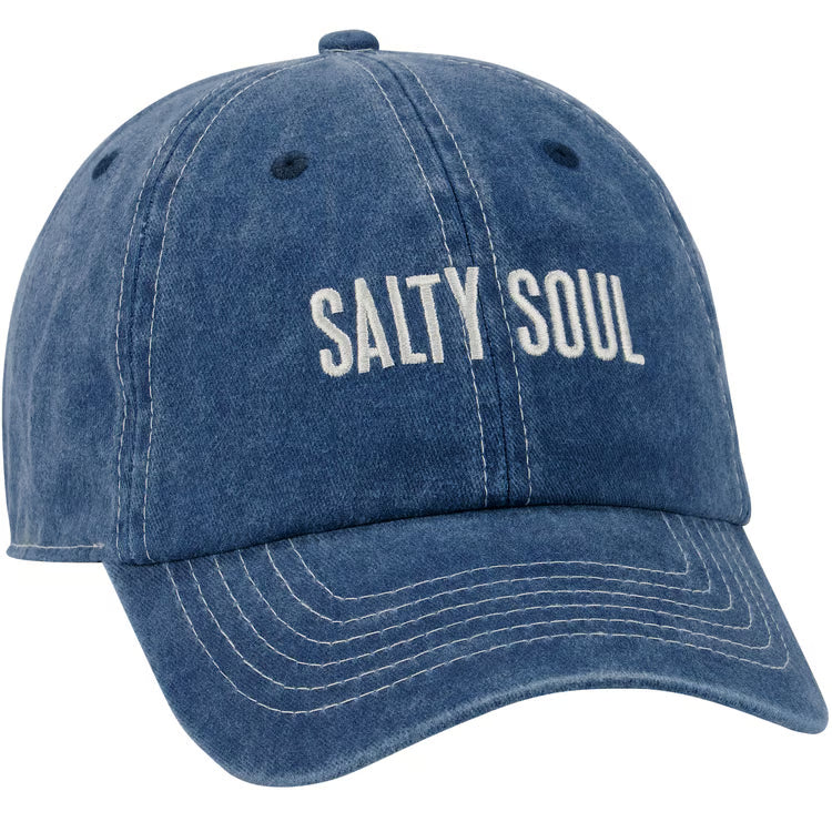 Features a box sign style embroidered "Salty Soul" sentiment. Our Salty Soul hat is one size fits most. Hand-wash only.