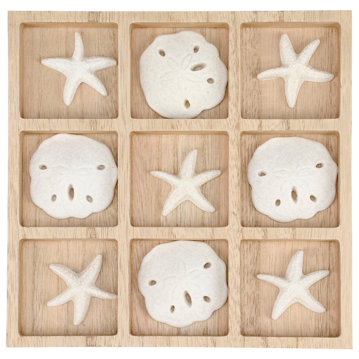 Bring coastal charm to your game nights with Tic Tac Shells, a premium tabletop game from our Beach Collection. This seashell-inspired take on classic tic tac toe features a natural wood board and 10 beautifully crafted shell-shaped playing pieces. When not in play, the pieces store neatly on the board, making it an attractive display piece for shelves and beach home decor. Perfect as a thoughtful gift for beach lovers, this themed game combines fun and functionality with effortless seaside style.