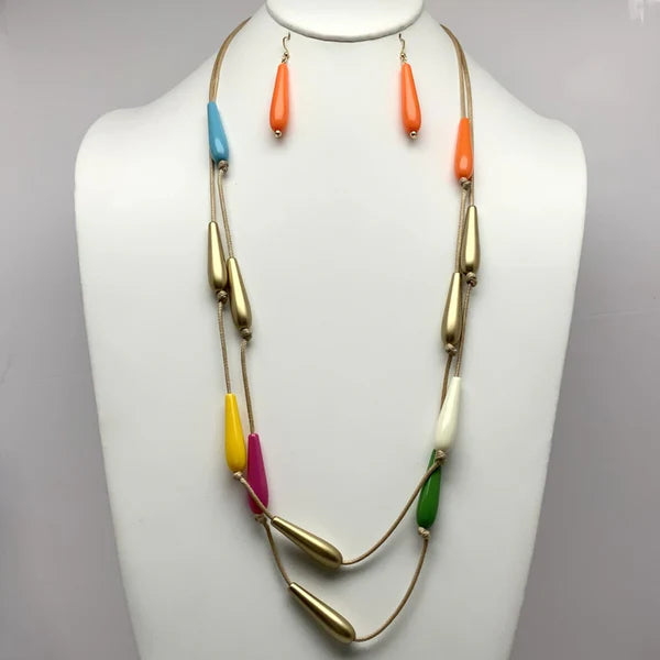Elevate your layered look with this stunning two-strand vinyl cord necklace set. Delicate tear drop spacers add dimension and movement, creating an eye-catching focal point that transitions seamlessly from day to night. The lightweight design ensures all-day comfort, while the vibrant multi-color palette complements any outfit. Perfect for stacking or wearing individually, this versatile set brings playful sophistication to your jewelry collection.