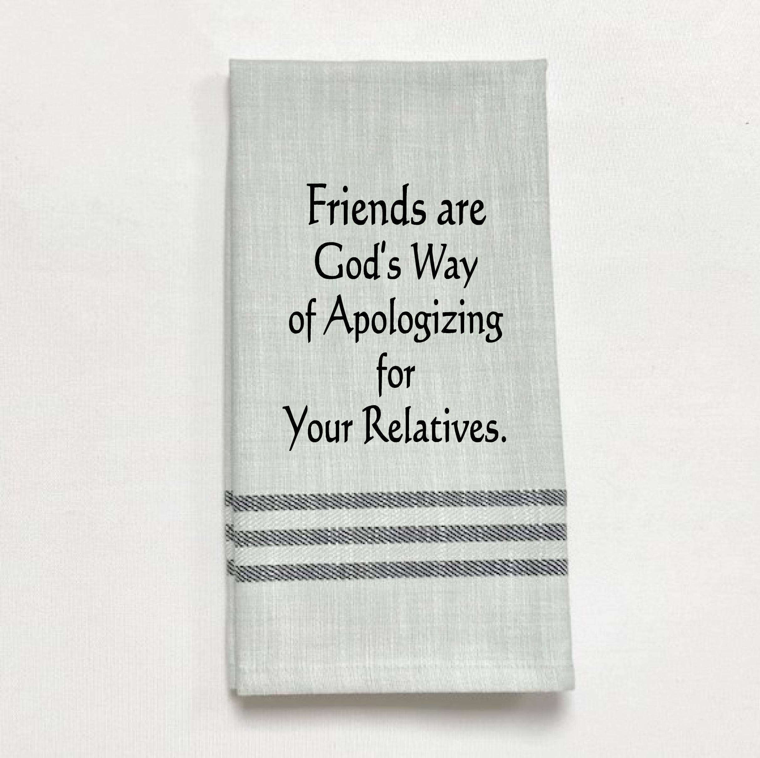 Friends are God's way of apologizing for your relatives—a witty reminder wrapped in premium 100% cotton twill. This hand-printed kitchen towel measures 16x26 inches and brings humor to everyday tasks. Machine washable and durable, it's a standout gift for anyone who appreciates sassy, relatable humor. Made in the USA with quality craftsmanship that goes beyond typical flour sack towels.