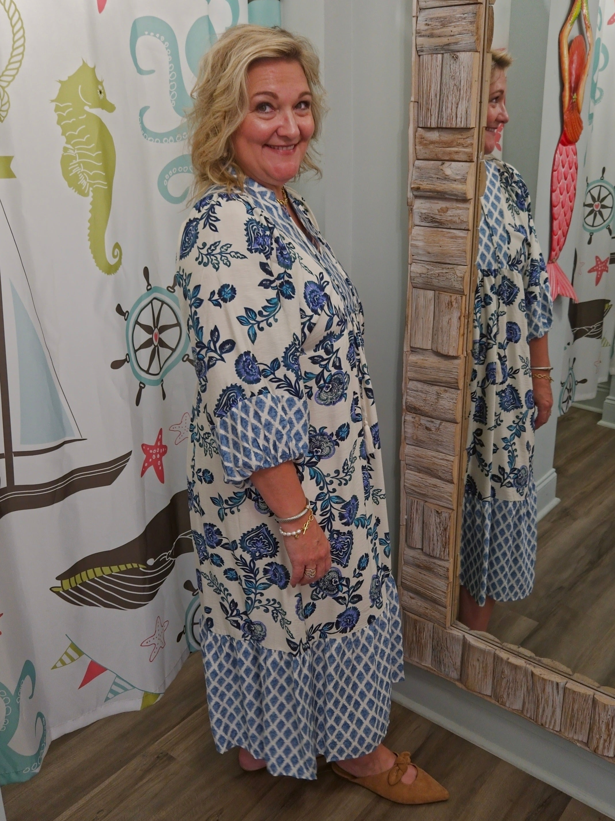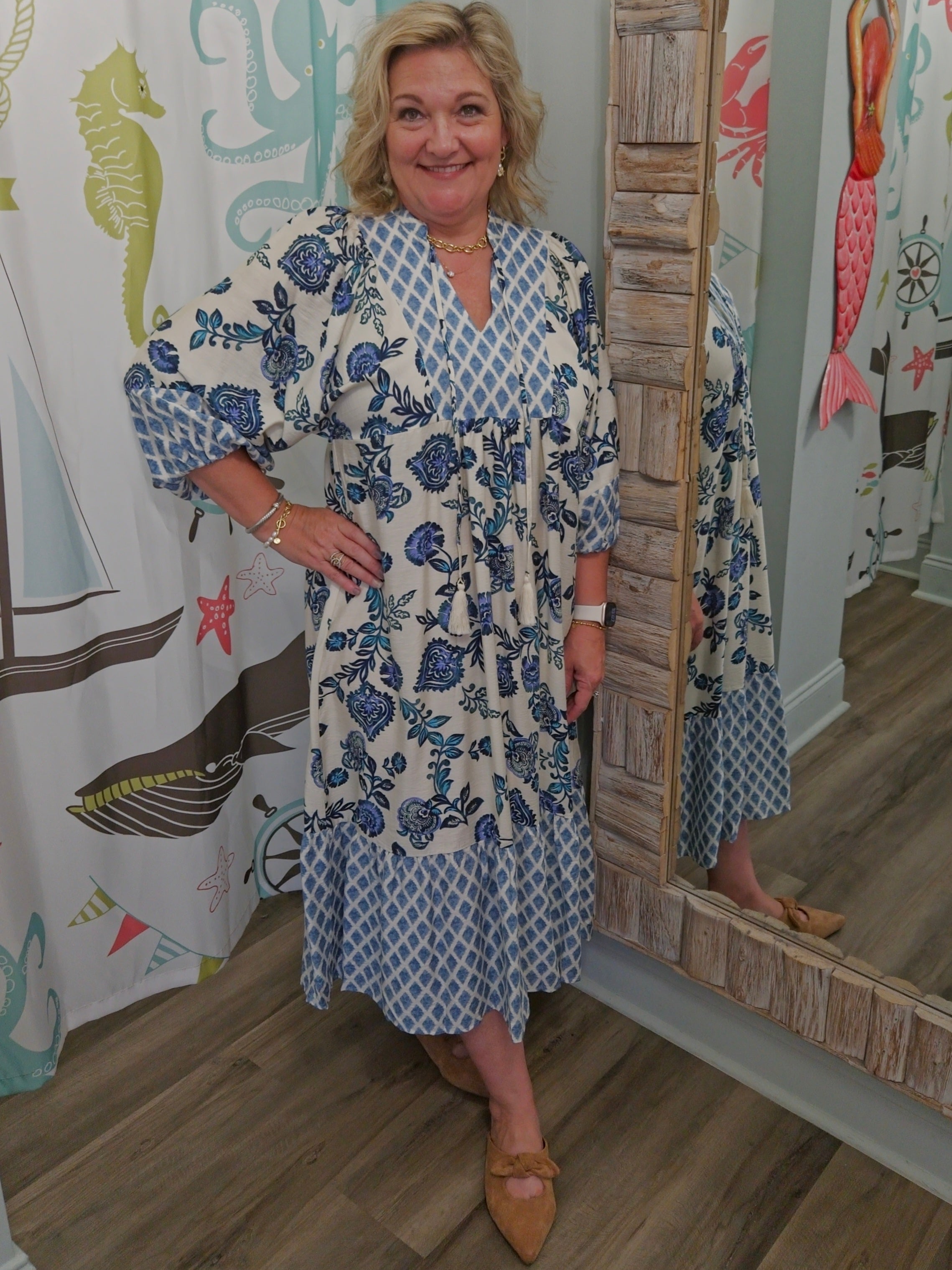 This mixed print boho maxi dress is full of free-spirited charm with its tiered hem and flowing silhouette. The V-neck with tassel tie detail and long balloon sleeves adds a touch of effortless elegance. Perfect for festivals, brunch dates, or weekend wanderings.