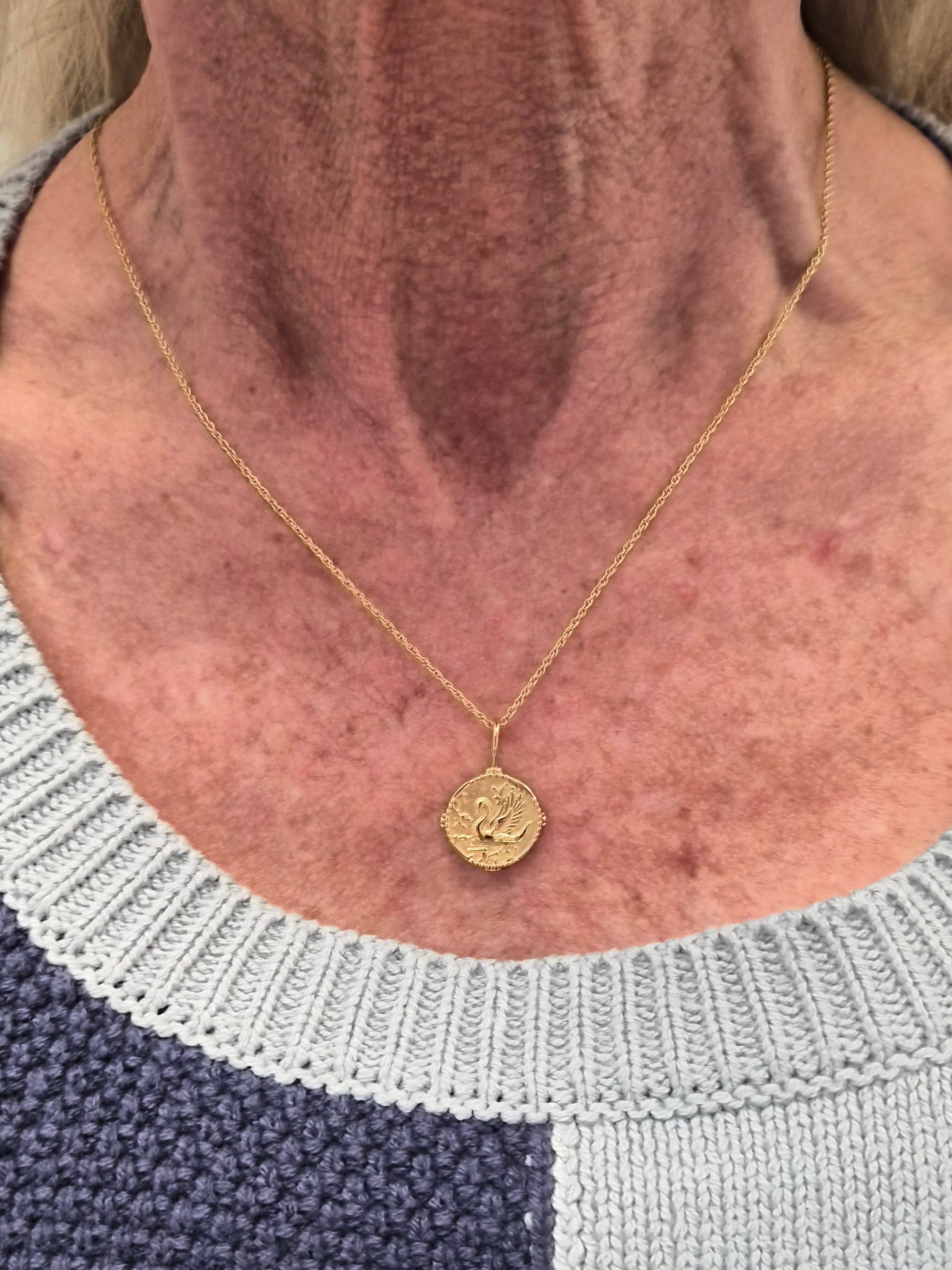 This necklace showcases a textured coin pendant on a delicate chain. A timeless piece with vintage-inspired charm, perfect for adding character to any outfit.