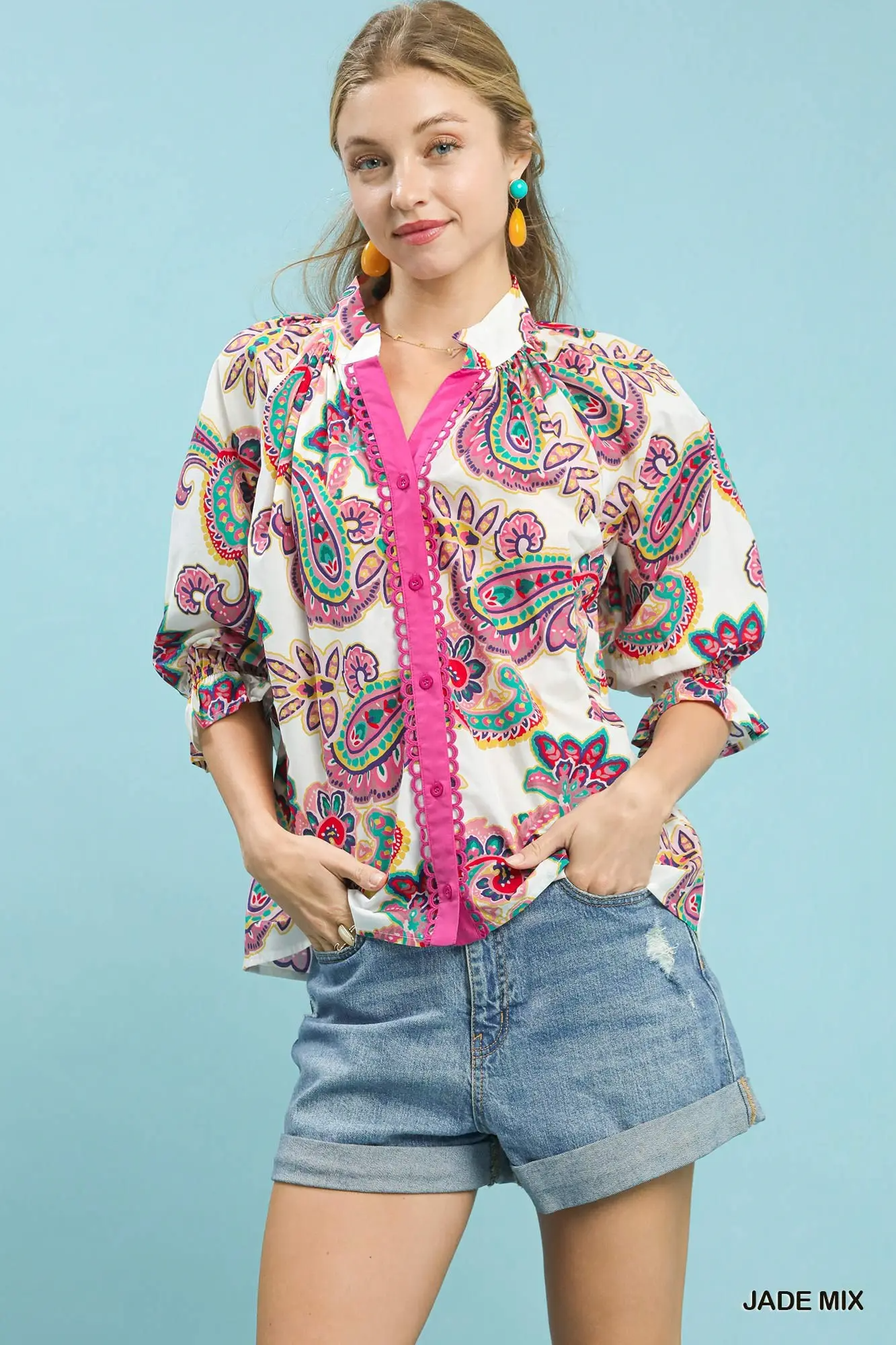 This printed blouse features a button-front closure with delicate scallop trim and playful 3/4 puff sleeves for an easy, feminine feel. The lightweight, unlined design keeps it comfortable and breathable, perfect for dressing up or down with your favorite bottoms.