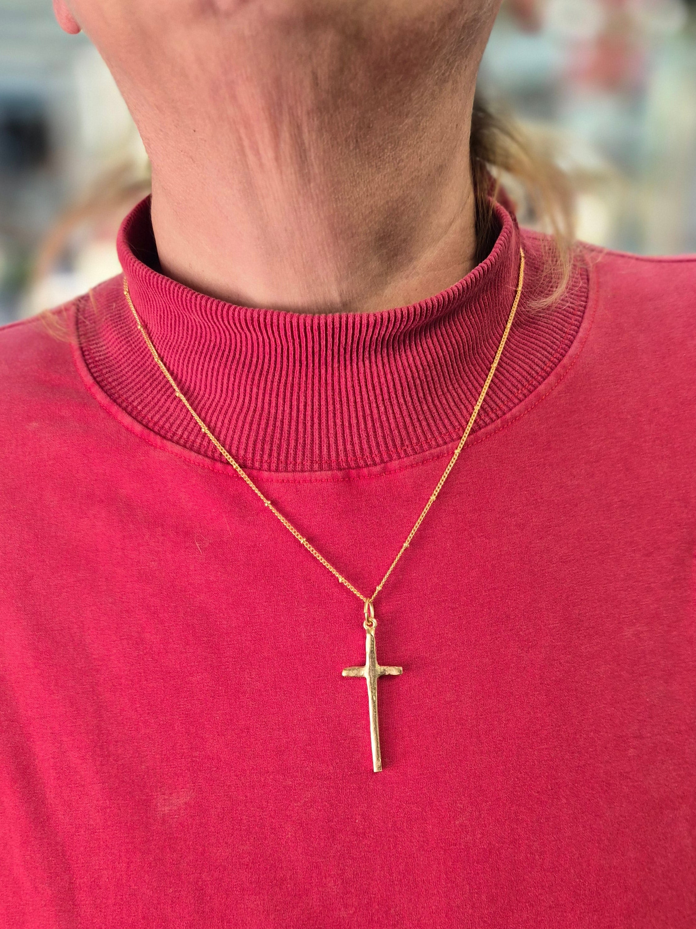 The Dainty Tall Cross Necklace is a fresh take on timeless faith and simple elegance. A slender hammered cross pendant hangs from a delicate beaded chain for a touch of beauty. Designed with a lobster clasp, this necklace layers beautifully or shines on its own. It’s a subtle yet stunning piece that moves effortlessly from day to night. Delicate and full of meaning.