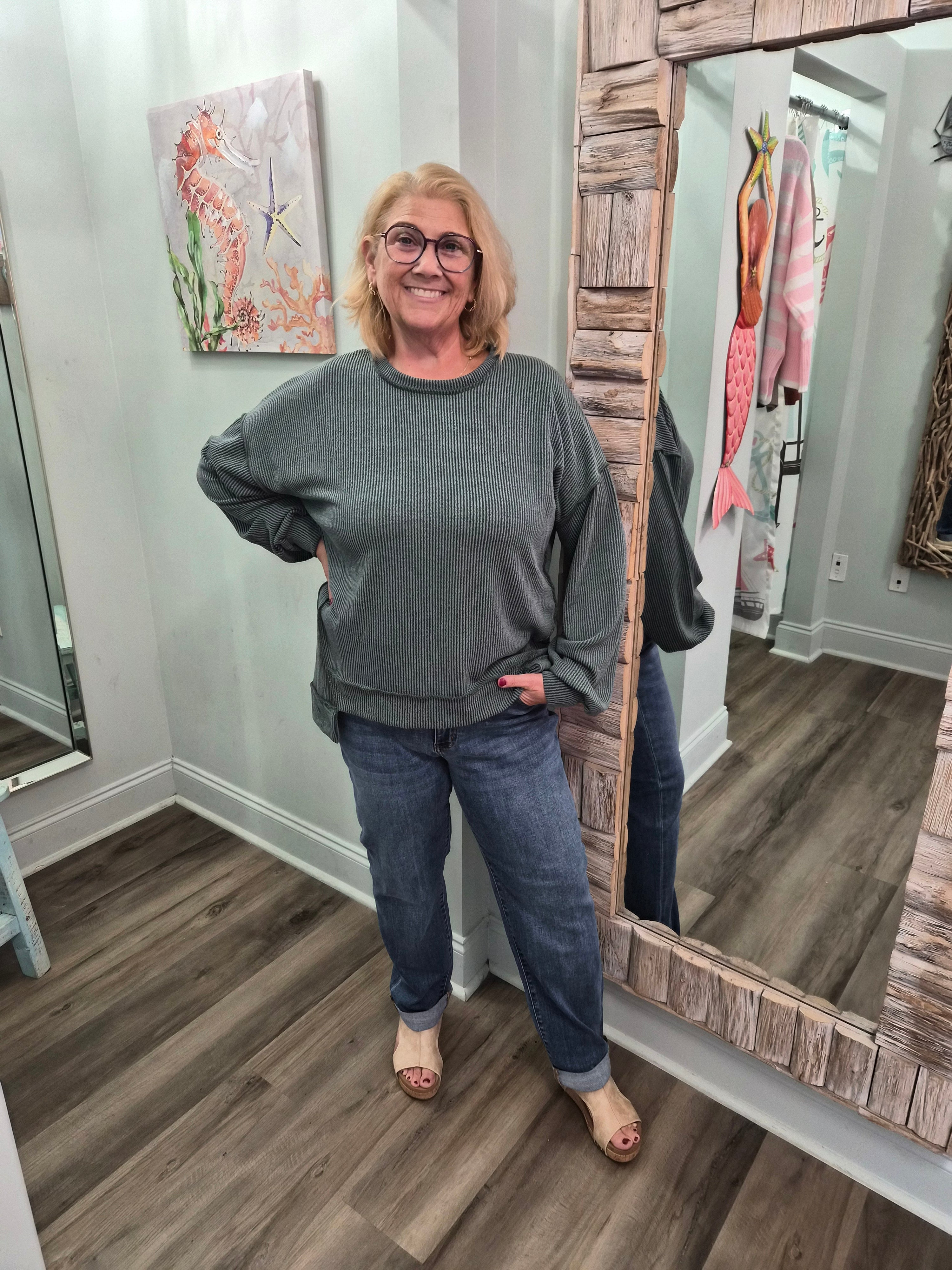 The Don't Stare Knit Top in Jade brings a playful twist to oversized comfort with its relaxed silhouette, forward side seams, and a dropped hem that adds effortless style. Its cozy crew neckline and balloon sleeves with cuffs make it perfect for everyday fun, mixing comfort with a touch of flair.