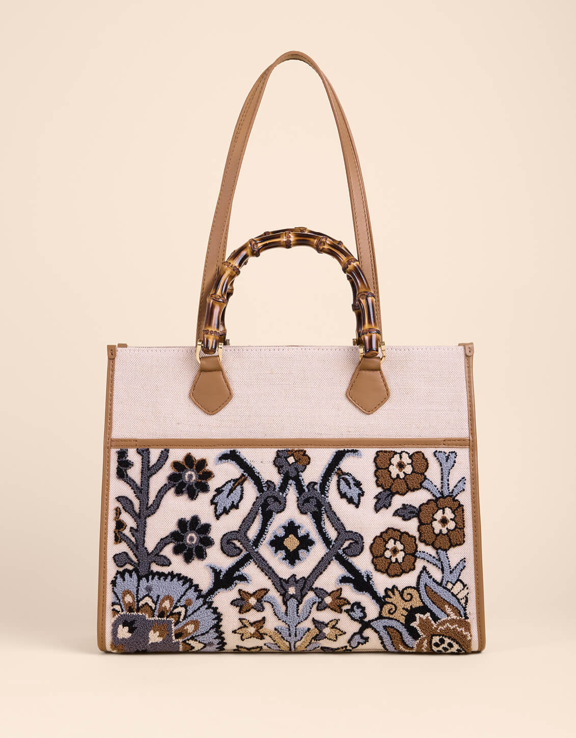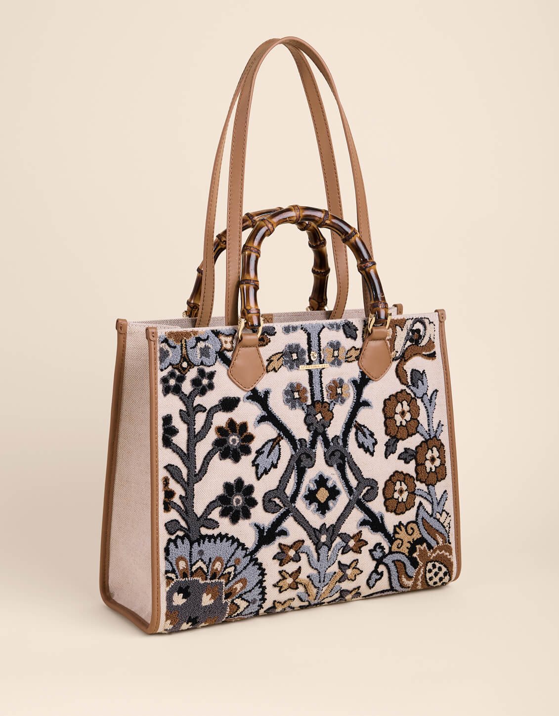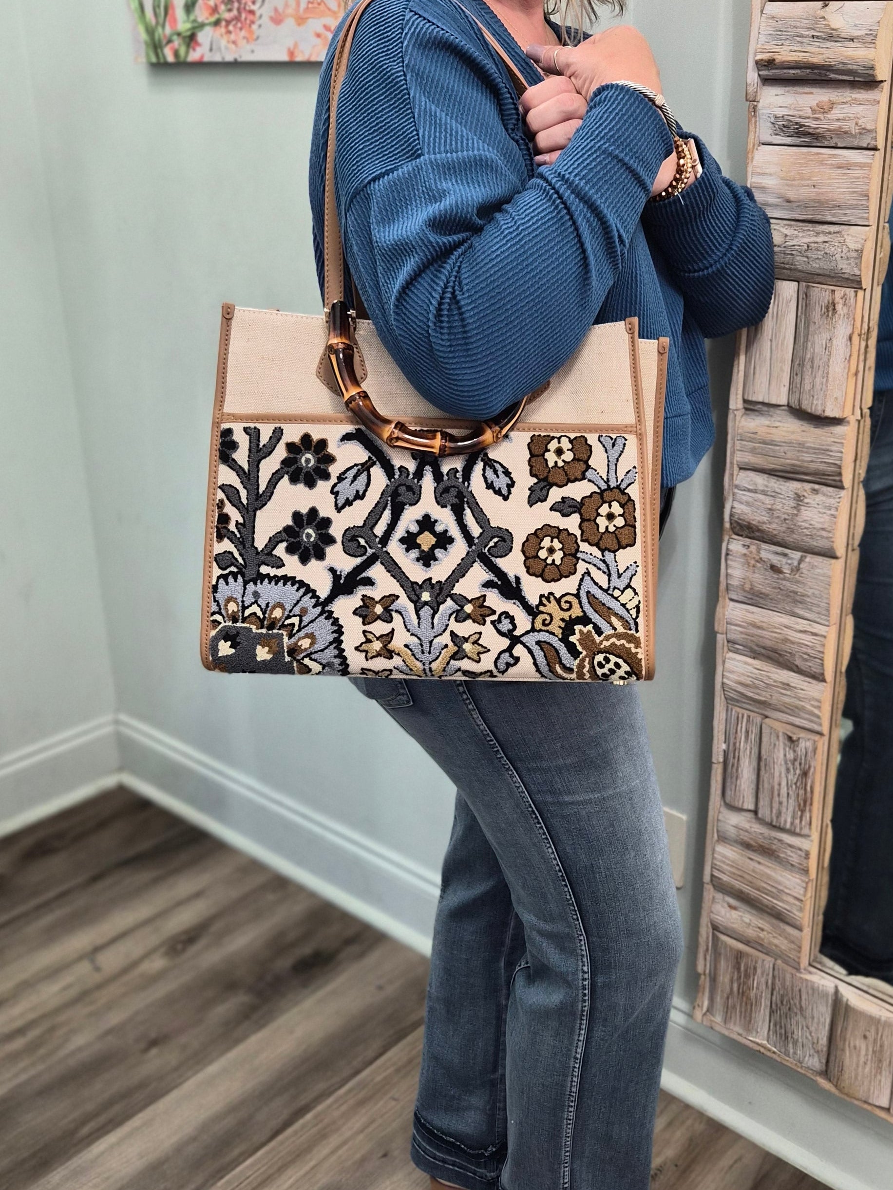 Dive into sophistication with the Luna Tote in Guerard Estate—where artistry meets everyday practicality. This intricately embroidered beauty boasts a custom bamboo drop handle and refined leather trim that elevate any ensemble. Slip your essentials into the roomy interior featuring two slip pockets and a secure zip pocket, plus an exterior pocket for quick access. An 11.5" shoulder strap and interior lobster clasp keep everything in place, while the spacious design accommodates even the largest iPhone. Pure luxury wrapped in thoughtful design.