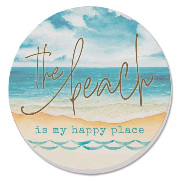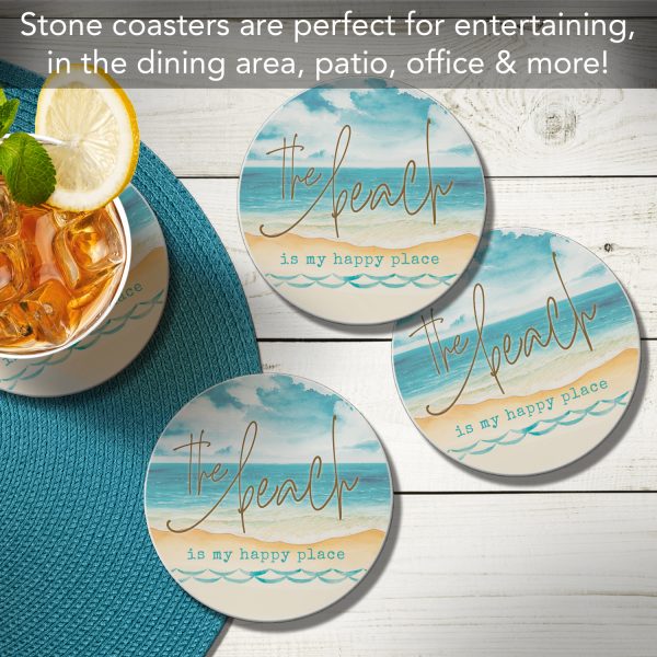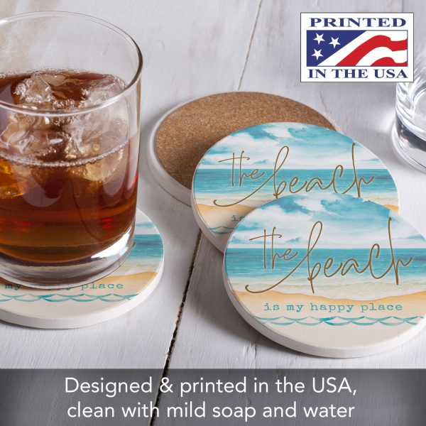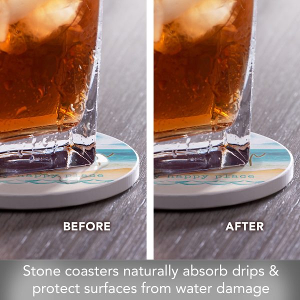 Love the beach? Protect your furniture with our My Happy Place Coaster Set. Made from natural stoneware, these absorbent coasters will keep your furniture looking new. Plus, the durable cork backing prevents scratches. Get a pack of 4 coasters, no holder included. Size: 4" round.