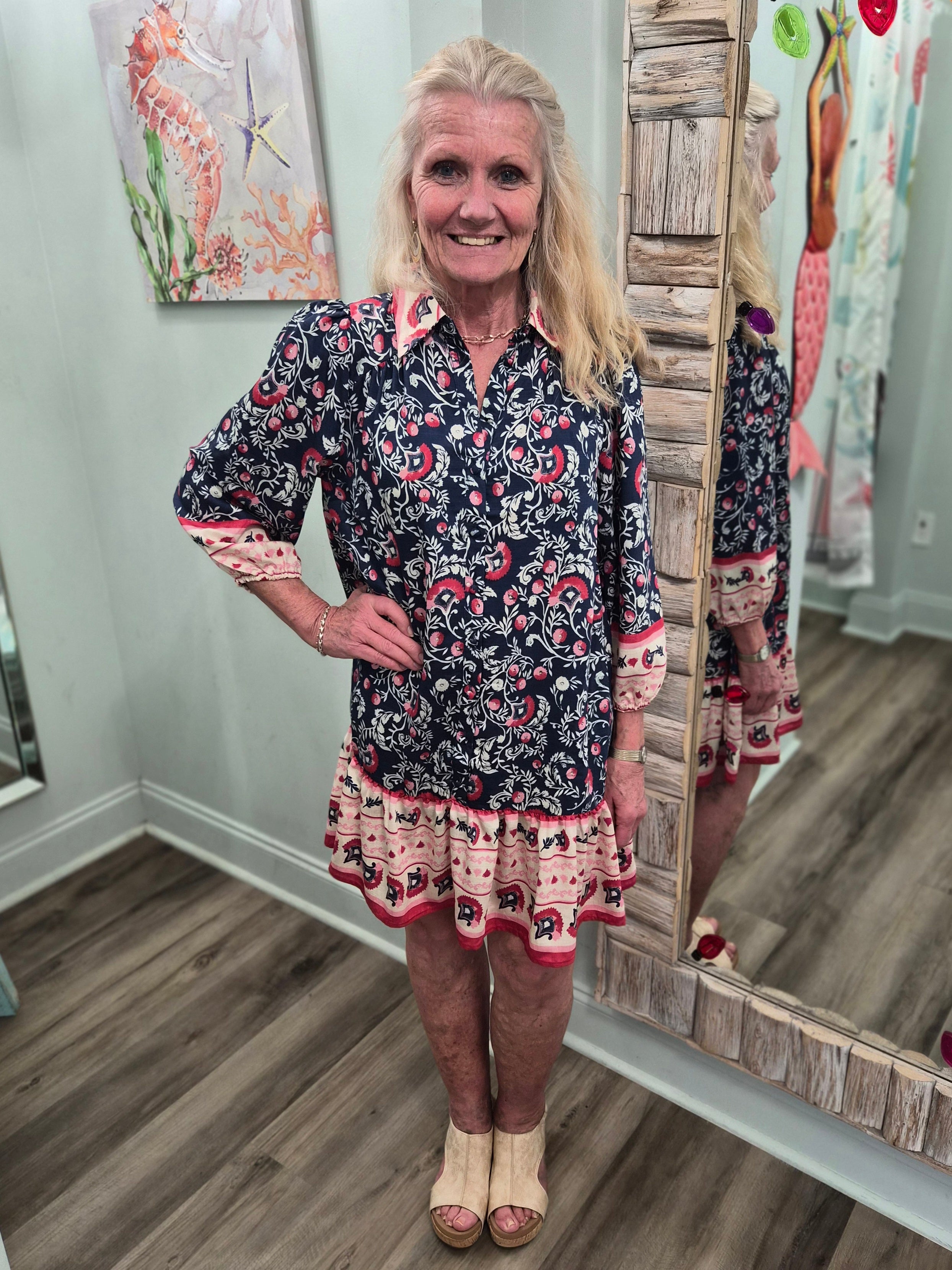 Embrace effortless style with this charming floral print tiered tunic dress. Featuring a classic collared button-front and long sleeves with elastic cuffs, it's designed for all-day comfort. The mini length showcases a gorgeous border print detail, while the relaxed, flowy silhouette keeps things breezy and fun. Perfect for casual outings or laid-back weekends, this unlined dress brings a playful vibe to your wardrobe.