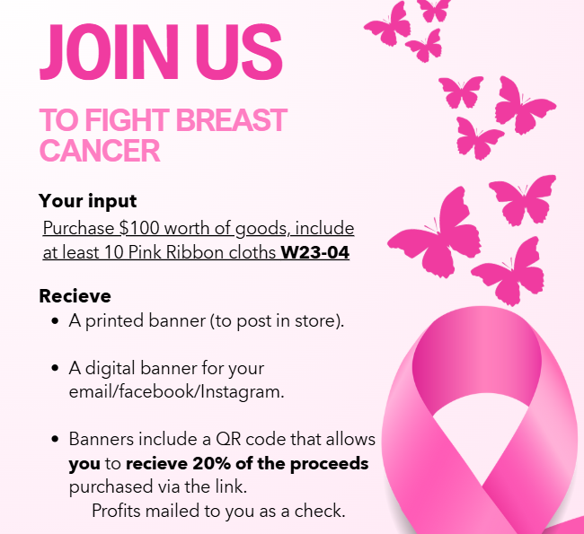 Join us to Rasie Money for Free Mammograms this October! Purchase 10 Pink Ribbon Cloths and we will give a portion to the National Breast Cancer Foundation to help those who cannot afford a screening. We will send you a banner with a link to our retail site, which you would then post in store and on social media. Since each store will have a unique code, we will be able to track sales. As an affiliate marketer, you will receive 20% of the sales that come from the link, PLUS we willl give another 5% of those sales to the NBCF. Your check will be mailed in November. Please add 10 of these to your cart to be automatically enrolled! Feel free to message us with any questions!