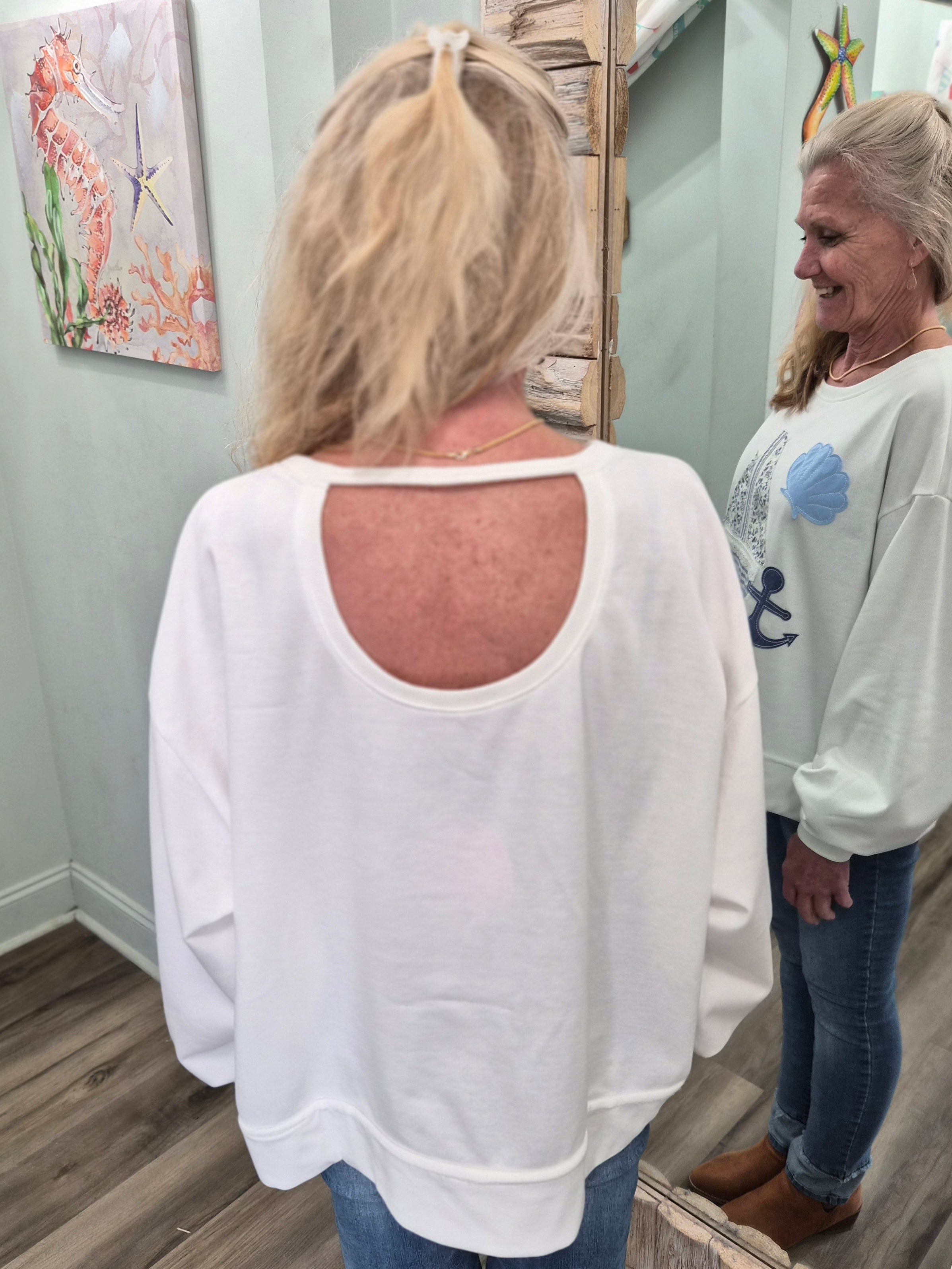 Catch the essence of coastal living with the Patchwork Sails Pullover. This soft cotton-blend pullover features charming nautical appliqués—sailboat, anchor, shell, and starfish—arranged in a playful patchwork design. The relaxed oversized silhouette and ribbed long sleeves deliver comfort for beach days, seaside strolls, or cozy evenings by the water. Versatile enough to layer or wear solo, it's the perfect addition to your summer and coastal wardrobe.