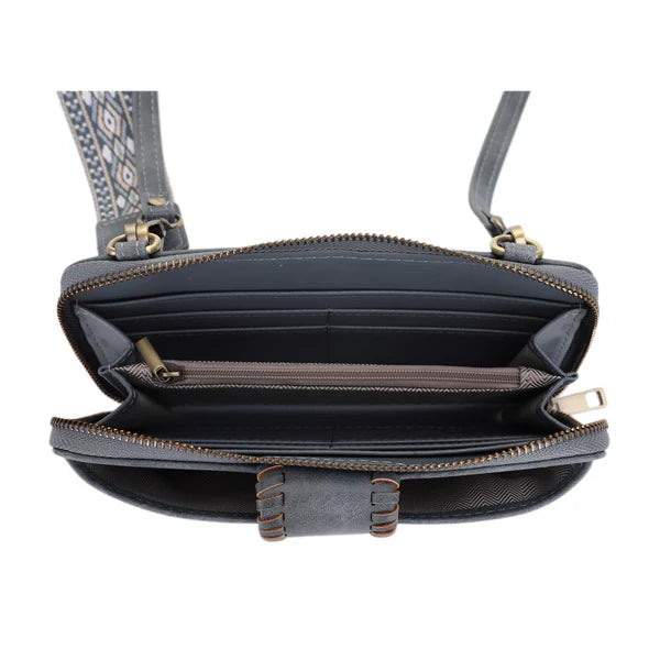 Carry your world with style in the Tipping Point Convertible Crossbody Bag. This chameleon of accessories transitions seamlessly from wristlet to crossbody with its removable, adjustable strap—perfect for whatever your day demands. The blue hue pairs beautifully with any outfit, while bronze hardware adds a touch of sophistication. Inside, sixteen card slots, bill pockets, and a zipper pocket keep everything in its place. A magnetic snap front pocket and smartphone slit pocket mean your essentials are always within reach. Whether you're running errands or heading out for the evening, this convertible wonder has you covered.