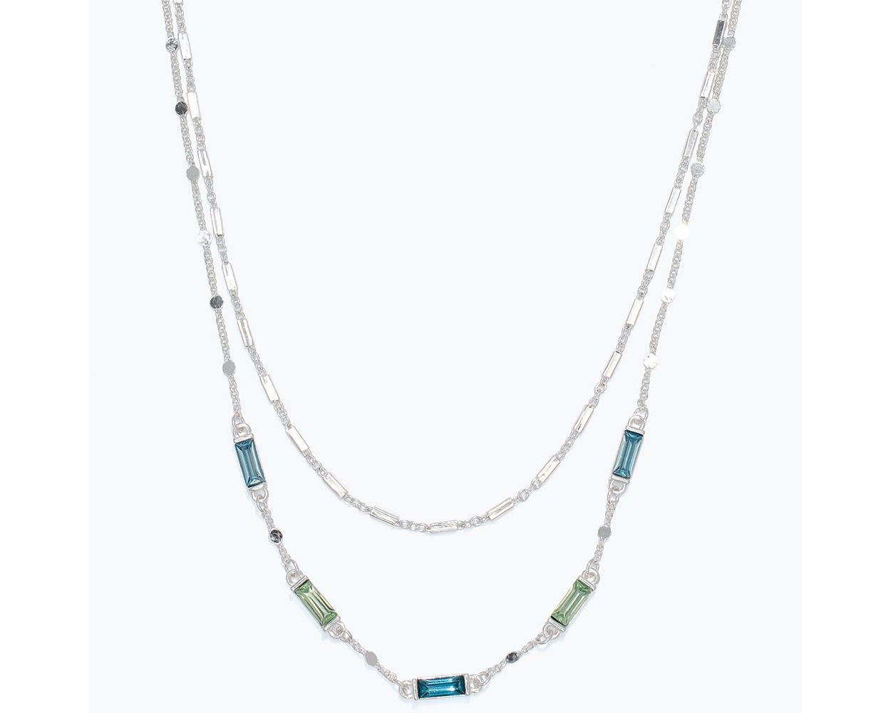 This Two-Strand Blue & Green Crystal Necklace features beautiful shades of blue and green crystals complemented by elegant silver chains. Its layered design adds depth and sophistication to any outfit, making it a versatile accessory for both casual and formal occasions. The combination of colors and silver accents enhances your look with a touch of refined charm.