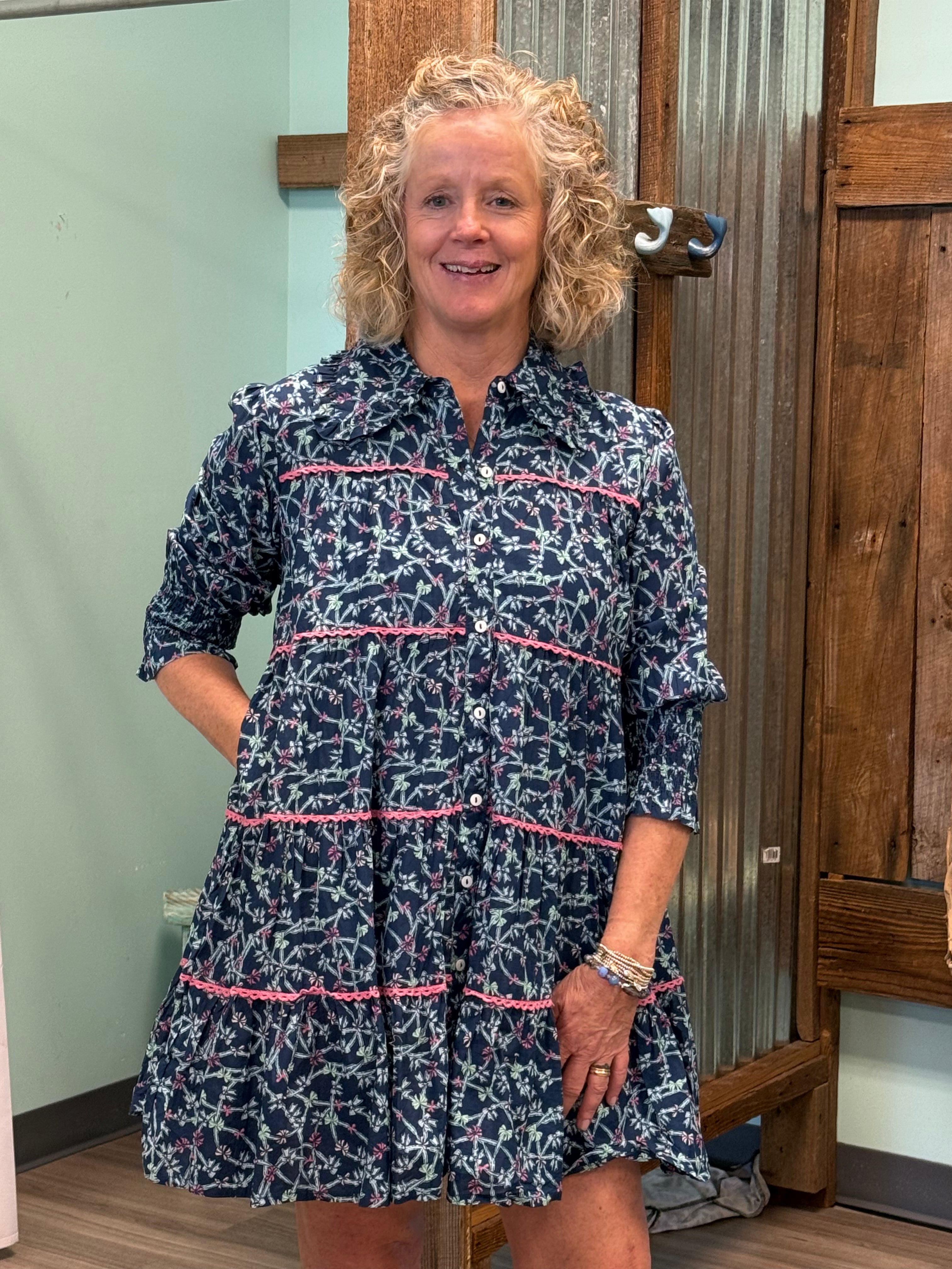 Embrace effortless charm with the We Can't Talk Babydoll Dress in Ribbon. This playful babydoll fit features a tiered skirt that moves with every step and a classic collared neckline with button-front closure. The shirred cuffed sleeves add a flirty touch, while the midi length keeps it perfect for any occasion. Crafted from 100% cotton for all-day comfort, it’s finished with a Simply Southern logo label for a signature look that’s as fun as you are.