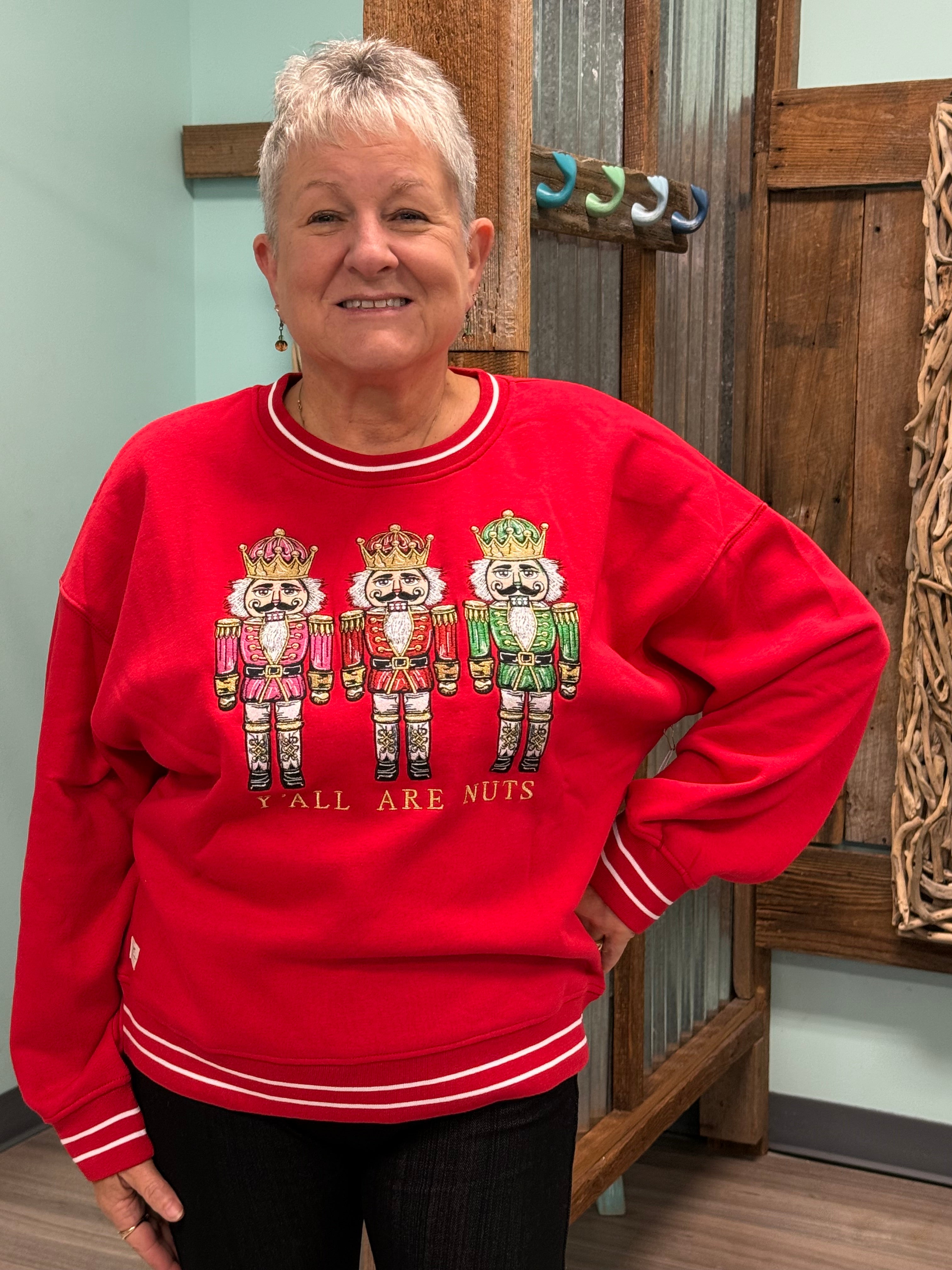 Celebrate the season with the Y'All Are Nuts Varsity Crewneck Sweatshirt! Featuring a playful lineup of nutcrackers and the cheeky phrase "Y'all Are Nuts," this cozy sweatshirt boasts a ribbed crew neckline, cuffs, and hem for a snug fit. Its regular fit body ensures comfort while the Simply Southern logo label adds a charming touch. Perfect for spreading holiday cheer with a fun twist!