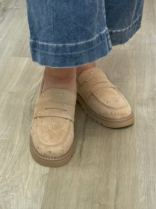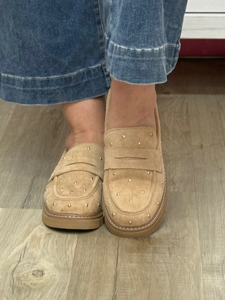 Corkys Stud Muffin Loafers In Sand Faux Suede