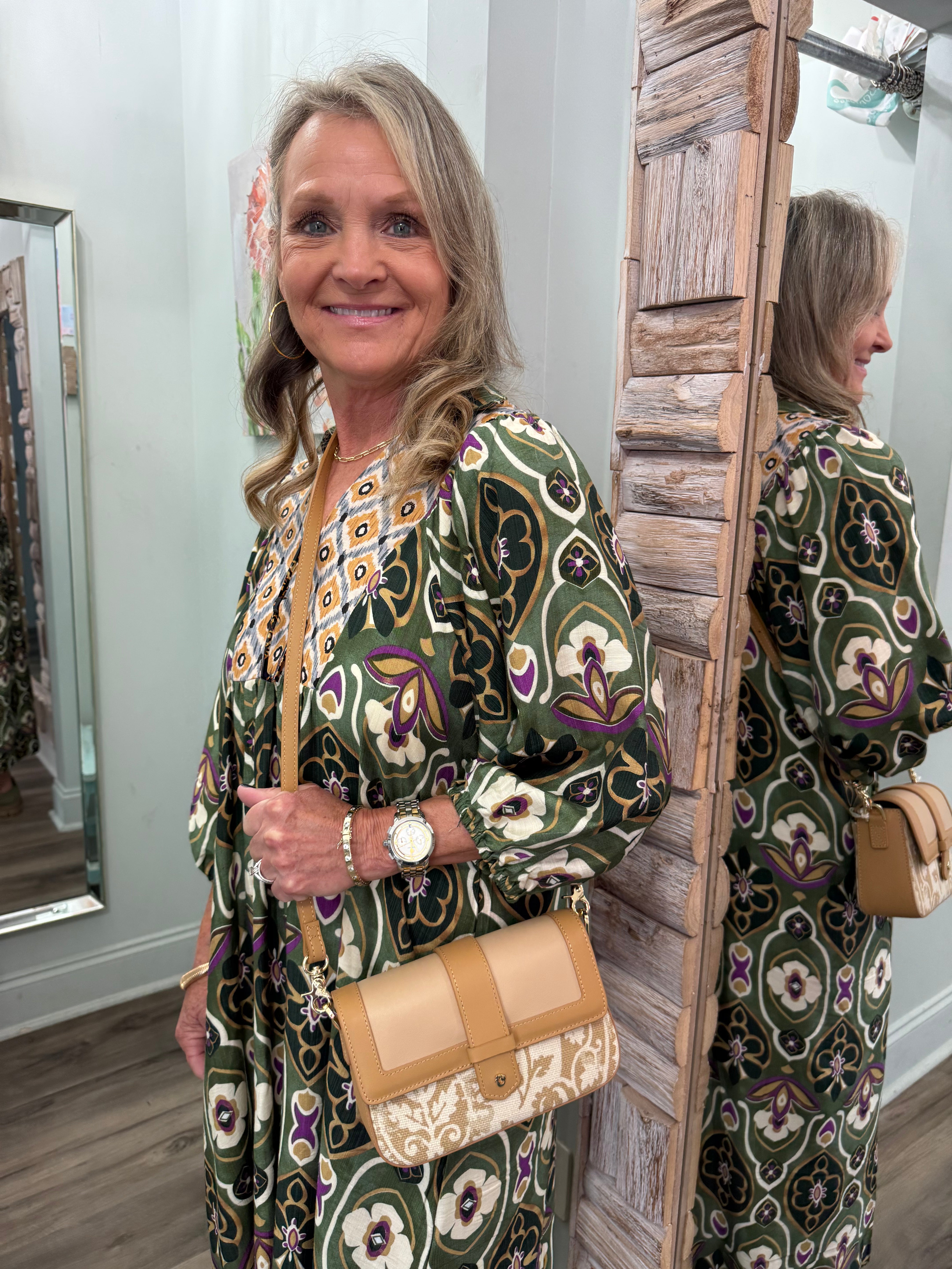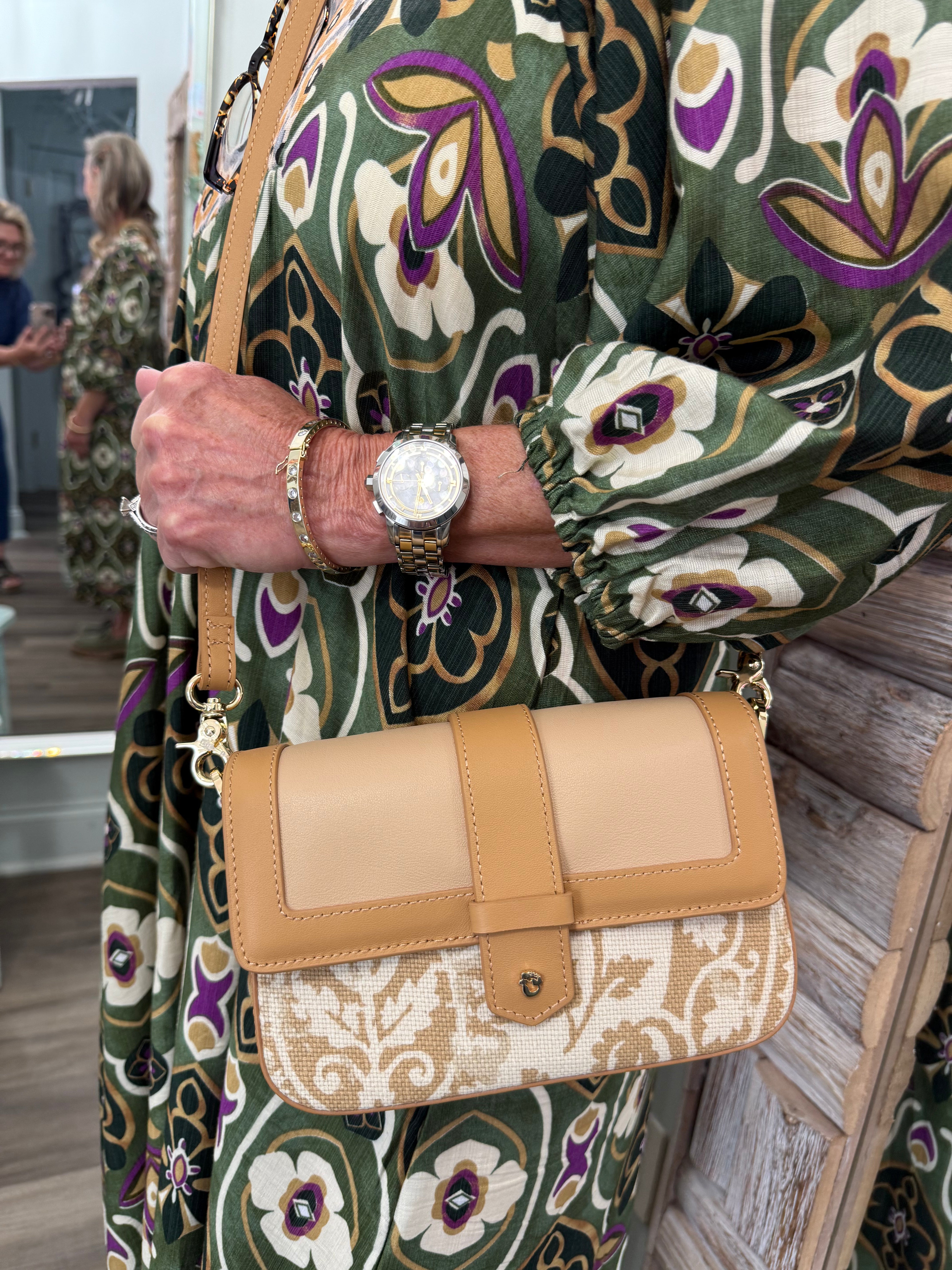 This chic bag combines signature linen with rich leather details for a timeless look. The faux belt magnetic closure and versatile design let you carry it as a crossbody or handheld with ease. With an exterior slip pocket, RFID lining, and organized interior, it’s as functional as it is stylish.