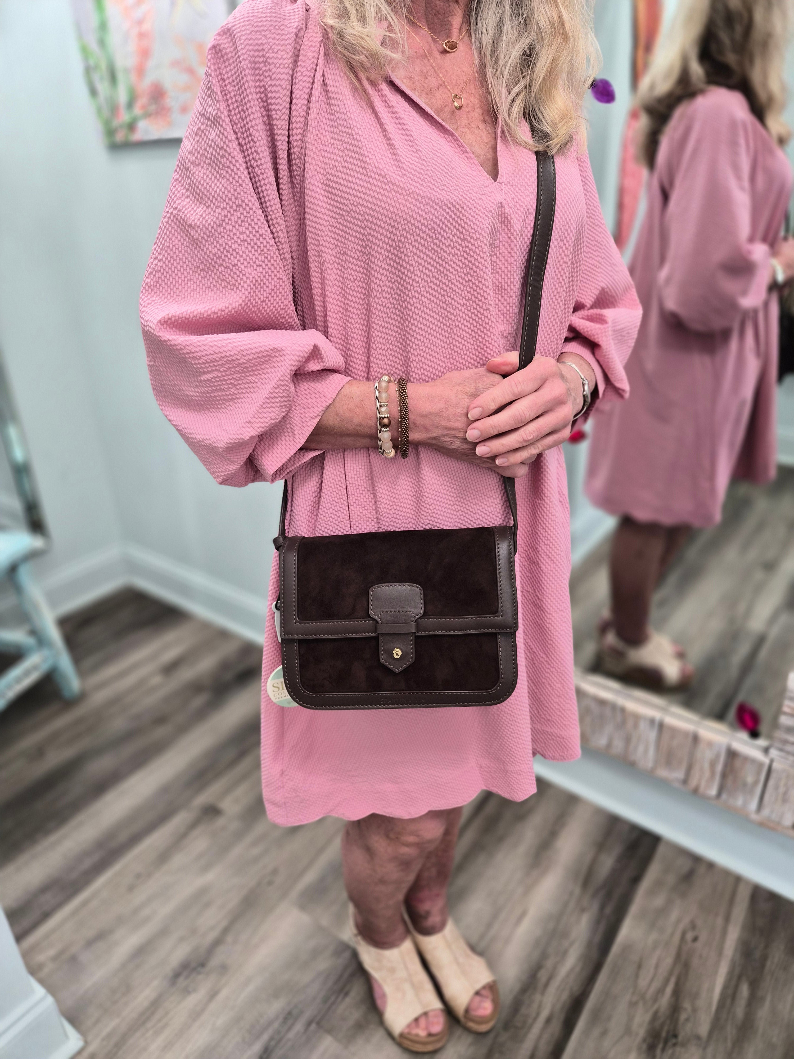 This chic crossbody keeps your essentials organized and your style on point! With interior slip and zip pockets tucked under a suede-lined flap and a faux belt magnetic closure, it’s as functional as it is fashionable. The back pocket and adjustable strap make it perfect for everyday errands or nights out on the town.