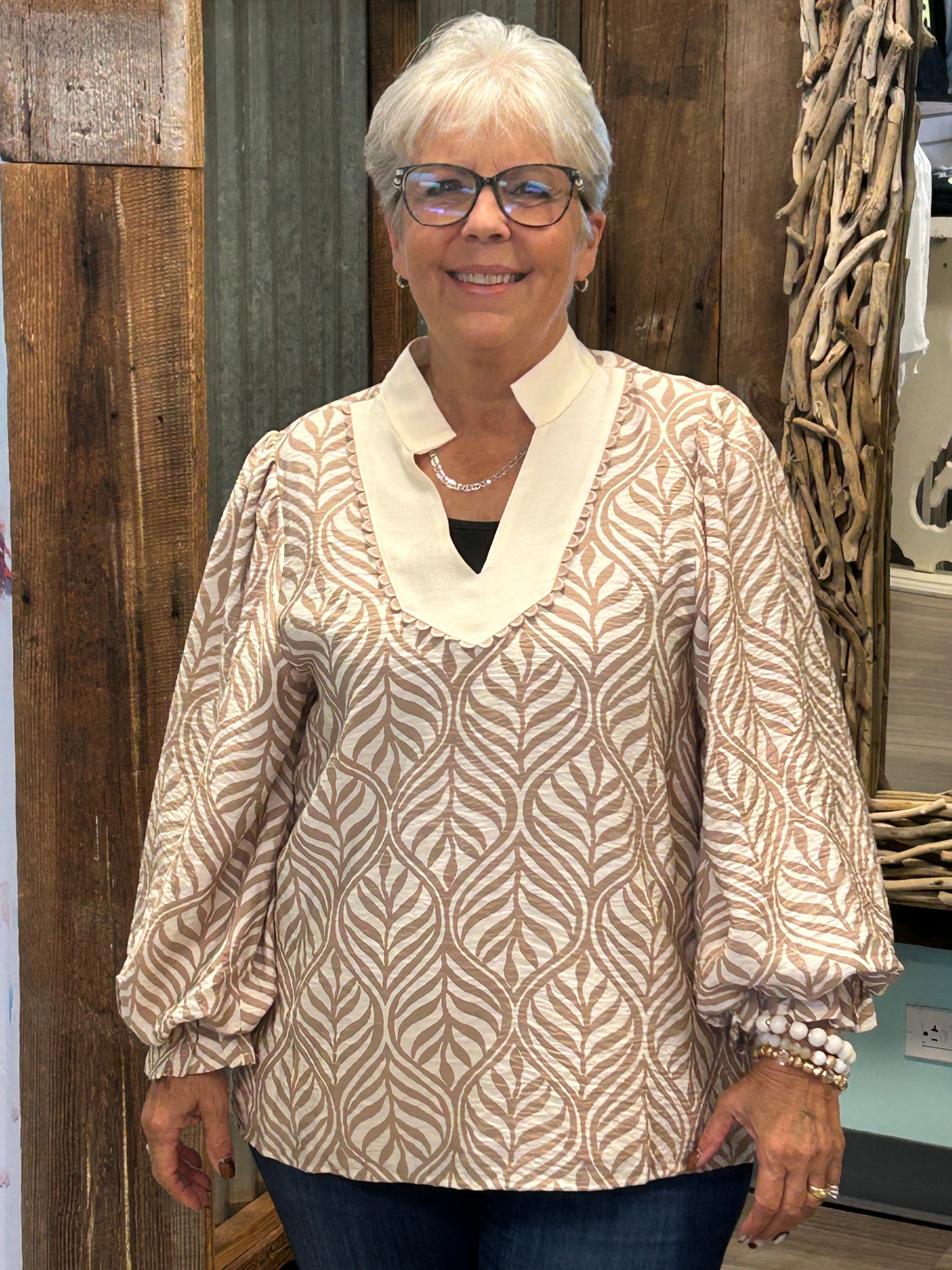 Embrace effortless charm with the Call Me Pretty Top in Taupe. Featuring playful 3/4 sleeves and a boho leaf print, this top balances its patterned elegance with a solid contrast and delicate lace trim. The standing collar adds a touch of flirty sophistication, making it perfect for day-to-night wear. Crafted from a soft blend of 80% rayon and 20% nylon, it feels light and comfortable all day long. Model is 5'10" and wearing a Small.
