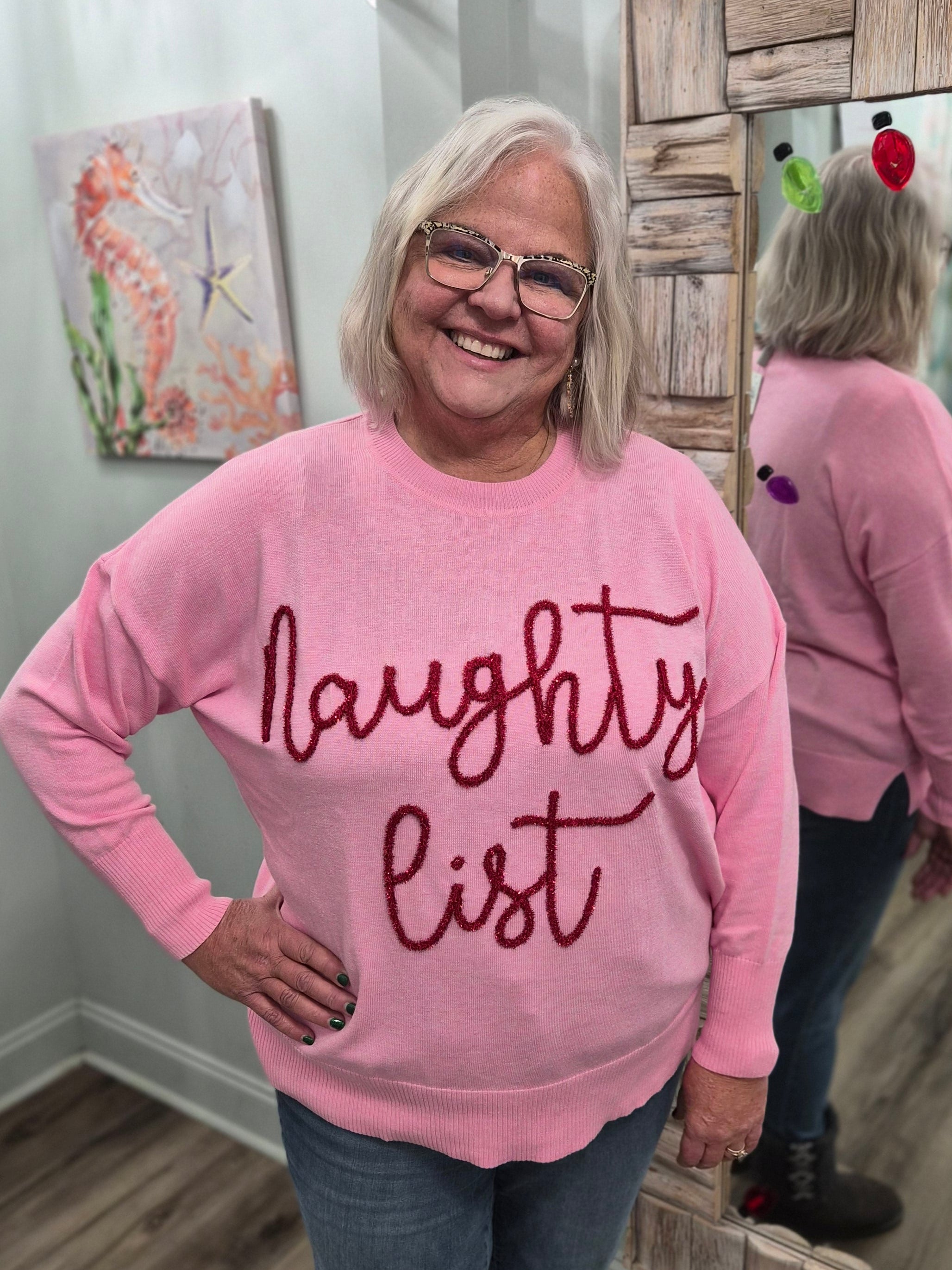 Add a little sass to your seasonal style with this cozy and oversized holiday sweater. Featuring playful fuzzy lettering that makes your list status very clear, this festive favorite is all about comfy vibes with a cheeky twist. Pair it with leggings or faux leather pants for a look that’s equal parts cozy and bold.