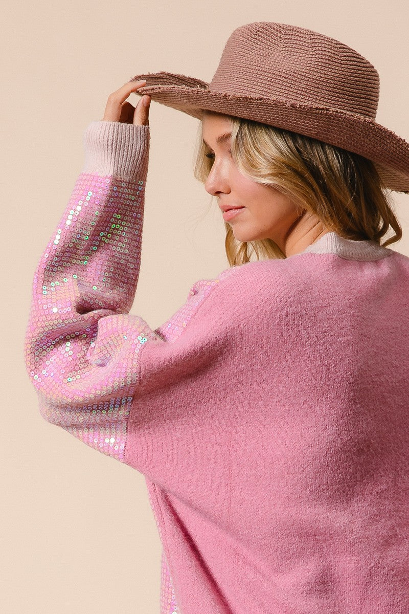 Get ready to sparkle this holiday season with the Santa Baby Sequin Sweater in Pink! This playful sweater top dazzles with shimmering sequins that catch every twinkle of light, making it perfect for festive parties or cozy winter days. Its vibrant pink hue adds a fun twist to classic Christmas cheer, ensuring you stand out with style and joy. Embrace the holiday spirit with a touch of sparkle and a whole lot of sass!