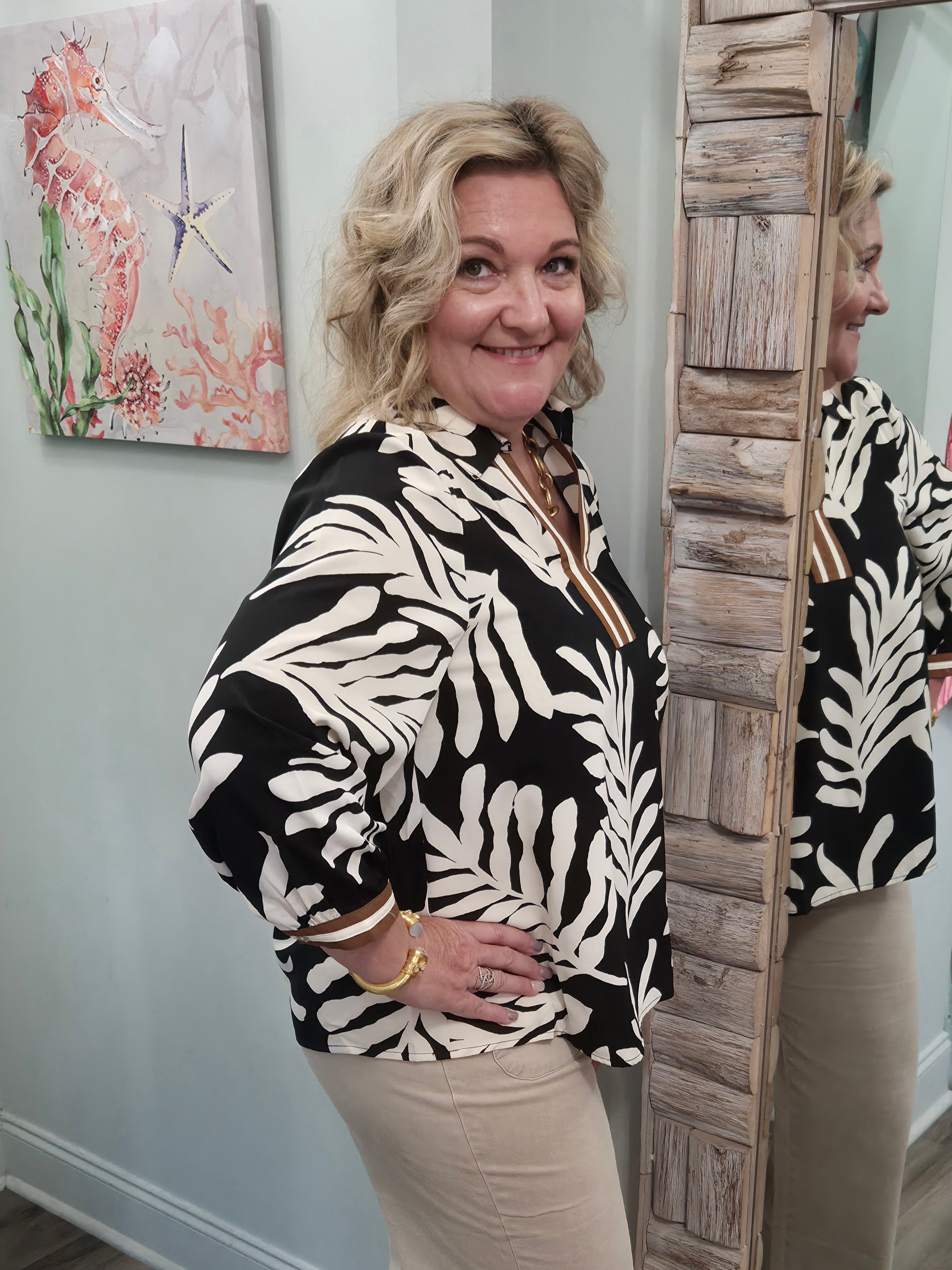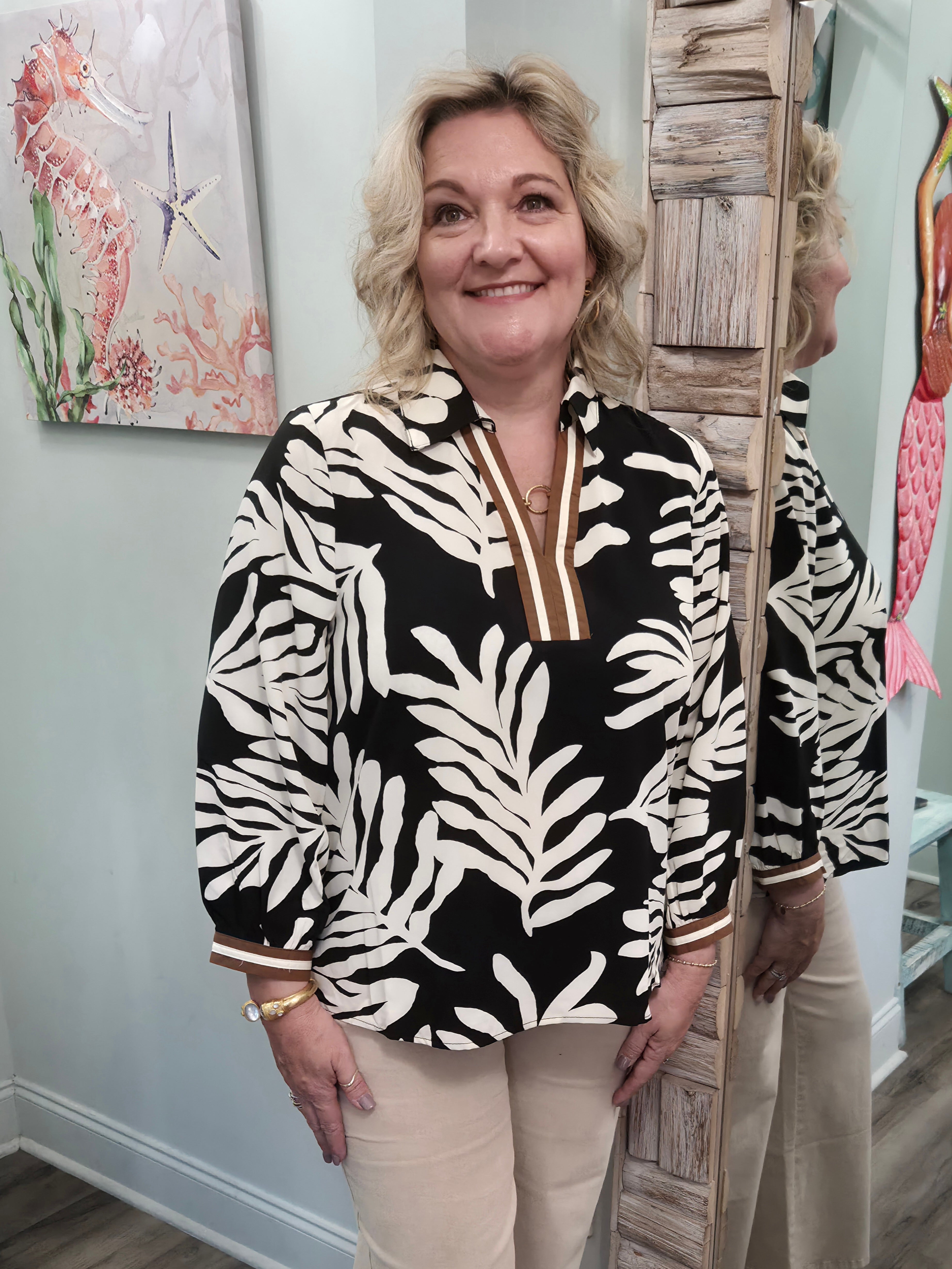 This leaf print top is all about effortless style with its 3/4 sleeves, V-neck, and collared neckline. A pleated back and stripe contrast details add a fun, unique twist. Pair it with jeans for everyday chic or dress it up with trousers for work!