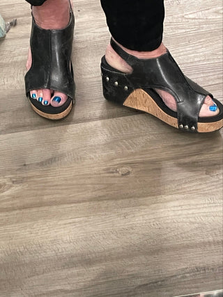 Corkys Make Em Blush Wedge Clogs In Black Faux Suede