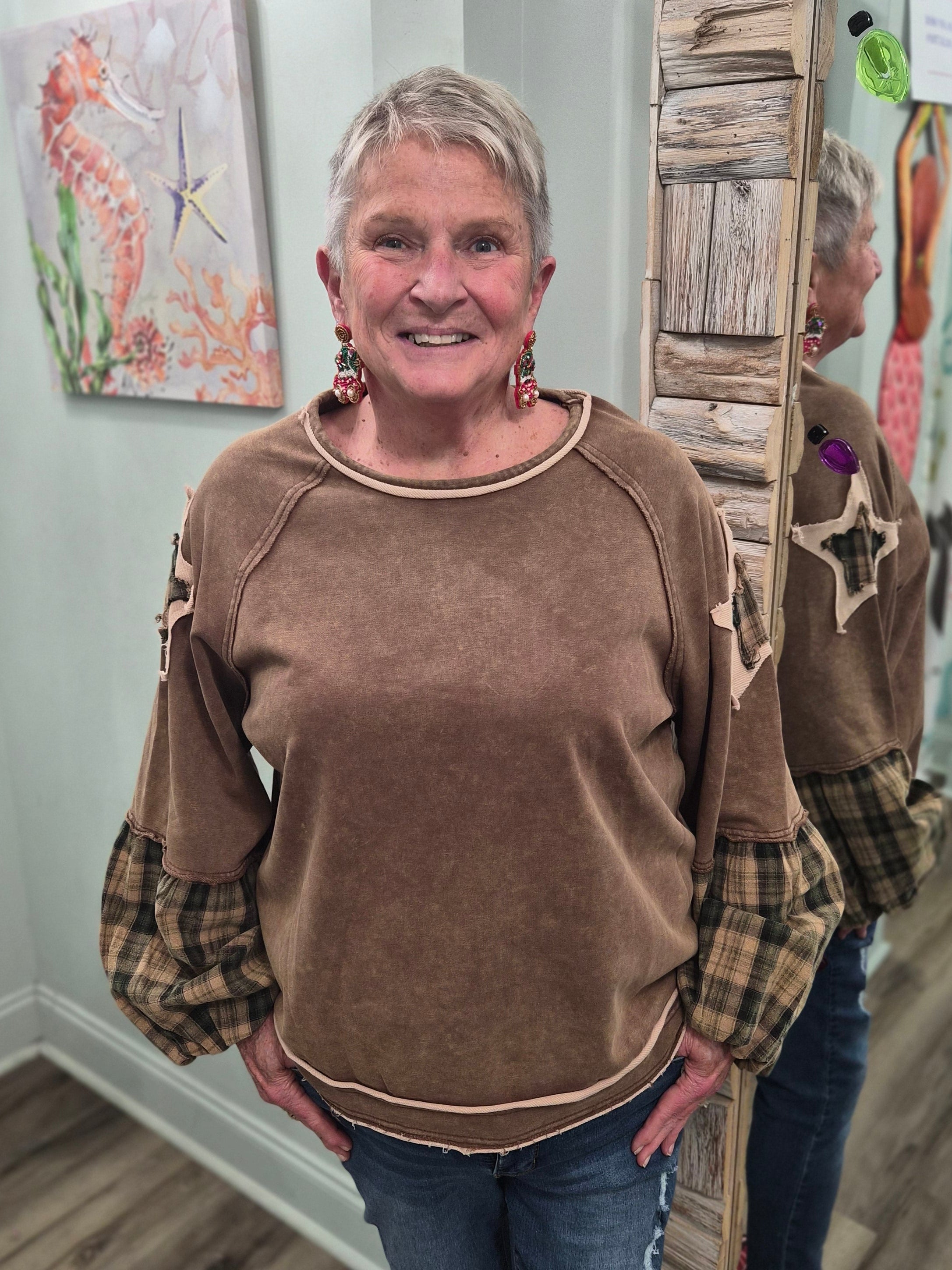 Cozy with a touch of edge, this mineral wash French terry pullover features raw-edge details, frayed star patches on the shoulders, and plaid balloon sleeves with patchwork charm. Its relaxed fit makes it perfect for layering on cool, casual days. Pair with jeans for weekend adventures or leggings for laid-back lounging!