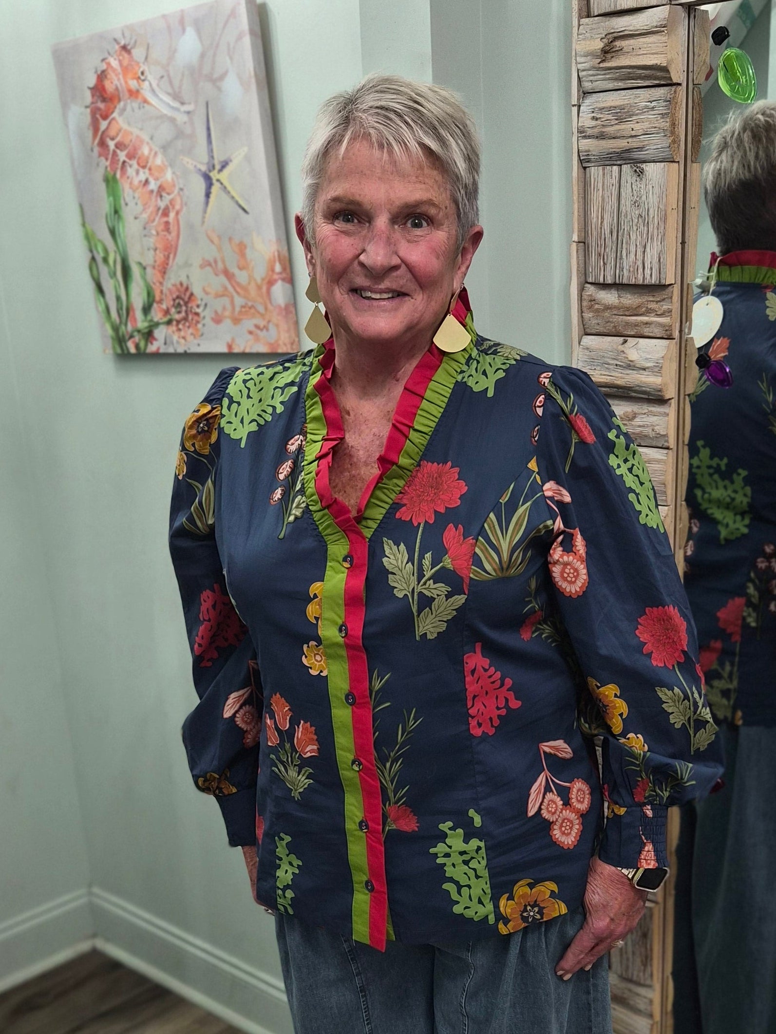 Bloom into the night with our A Night Of Florals Top, where vibrant multicolor blooms dance across midnight fabric. This charming button-down features a flattering V-neckline adorned with delicate ruffle trim, while romantic puff sleeves add a whimsical touch. Perfect for garden parties, brunch dates, or whenever you want to bring a splash of botanical beauty to your wardrobe. Unlined for breathable comfort.